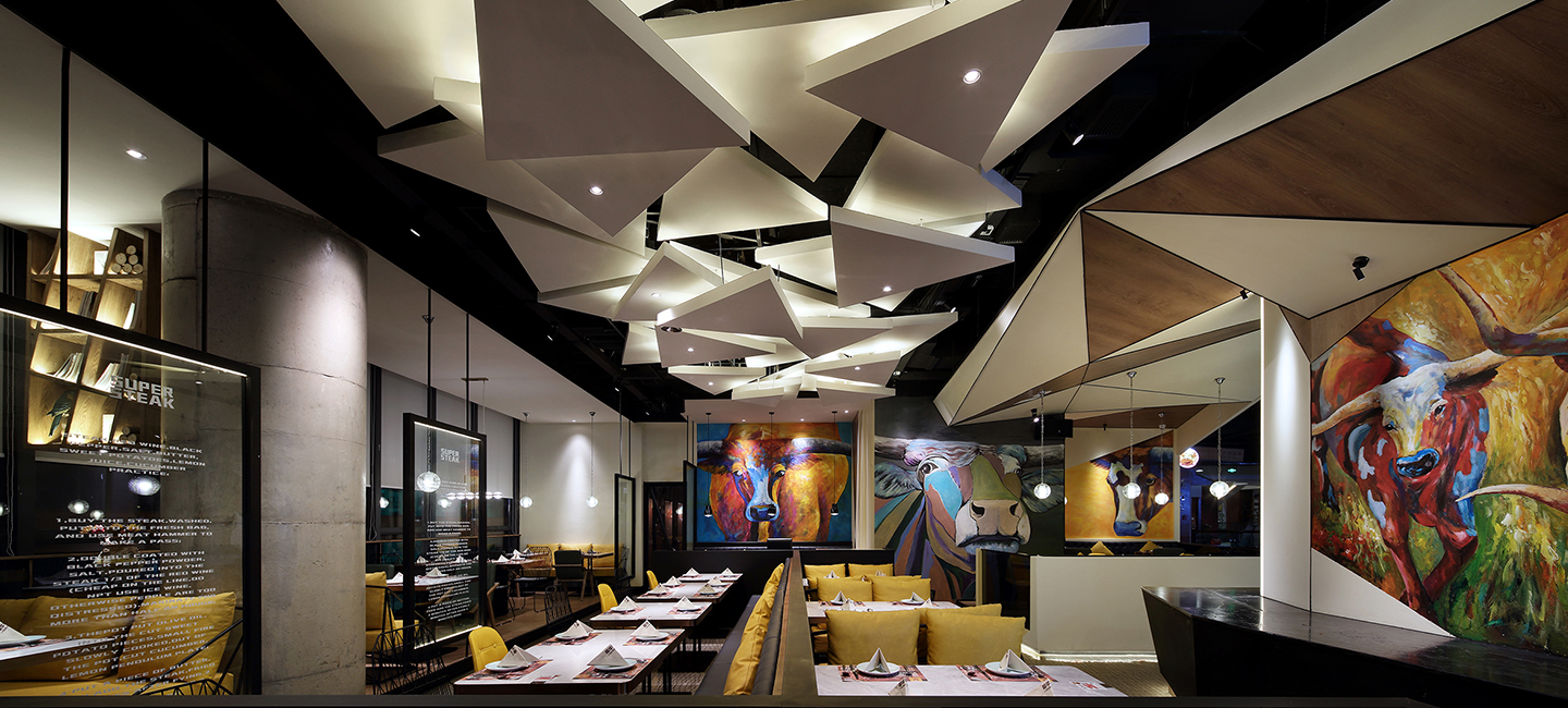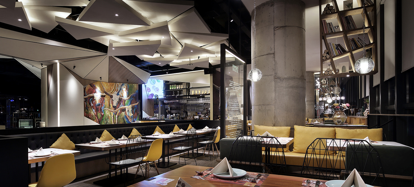 這次西餐館設計以黑白咖色為主色調,空間內注入明亮的橘黃色,讓整個空間在原本沉悶的色調里變得明快時尚起來。采用白色肌理漆,柚木面做空間切割面的造型,空間木色的運用完美契合餐廳的主打產品果木牛排的主題演繹。