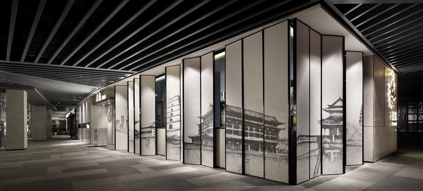 本案靈感從海洋概念中提煉水元素,以弧的形式呈現(xiàn)在空間里,用現(xiàn)代時尚感的筆法描述有歷史余溫的飲食故事。凝固的空間,流動的歷史,傳統(tǒng)與現(xiàn)代共生,時尚與復古俱存。“長安回望繡成堆,山頂千門次第開。”門面采用書簡的設計手法,一扇扇門半開半闔,營造著端莊的序列感和層次感。西安建筑的影像鋪陳出一幅流動的畫卷,溫潤燈光映襯歲月的質感,千年波瀾壯闊的歷史徐徐展開,拉開時空交錯的序幕。