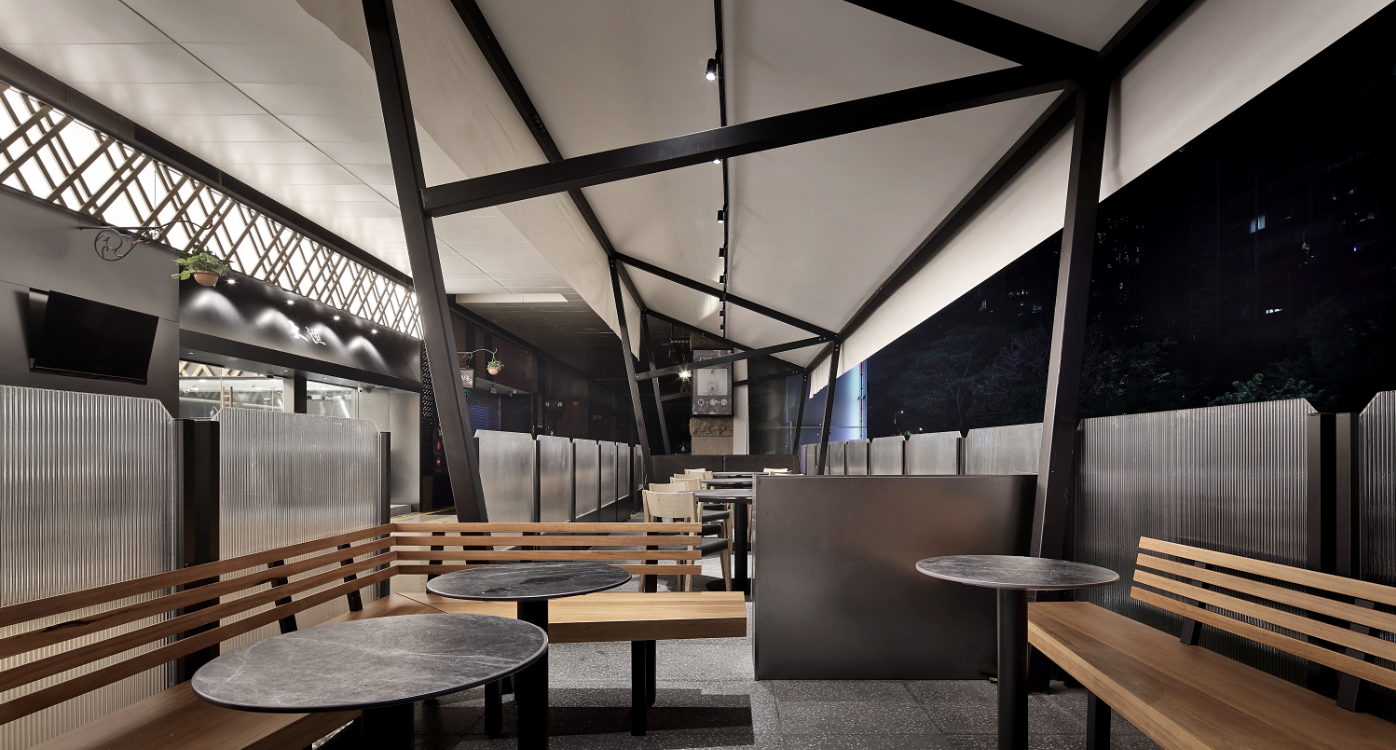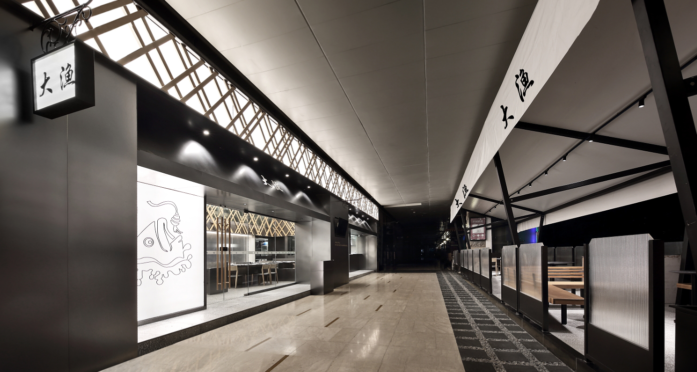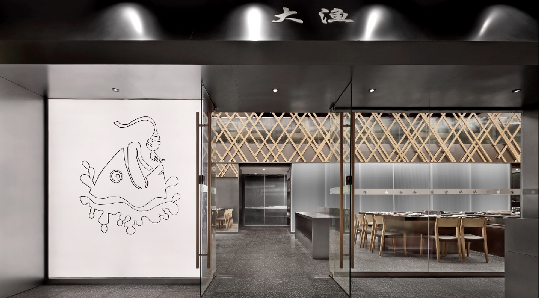 猶如大魚到鯤鵬的靈感轉化,全新的大漁空間帶給顧客強烈的視覺沖擊力,讓人耳目一新。同時,還令本案和周邊建筑群形成鮮明的對比,在視覺形成突顯優勢。本案空間有2層+一樓外擺區。雨棚形式的門頭,開拓著空間,給人收放自如之感;休閑的外擺區,則是放松休憩的空間,一張一弛,輕松自如;