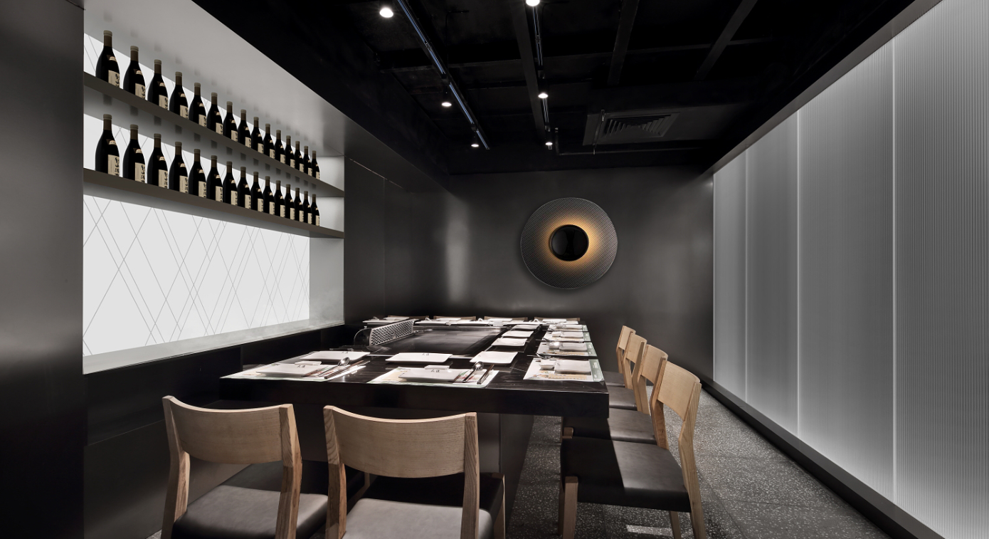 來到二樓,卡座區和中間鐵板以水紋波加燈光的設計,讓魚躍的動態之感從眼里牽引到舌尖,默契配合大漁品牌和豐富菜品在視覺、味覺上的完美呈現。開闊的大廳、開放的明檔、簡約的燈箱、硬質的鋼板、格調包間和雅致過道……多種材質的巧妙配合,營造出日式簡約空間,給人輕松浪漫的感覺。