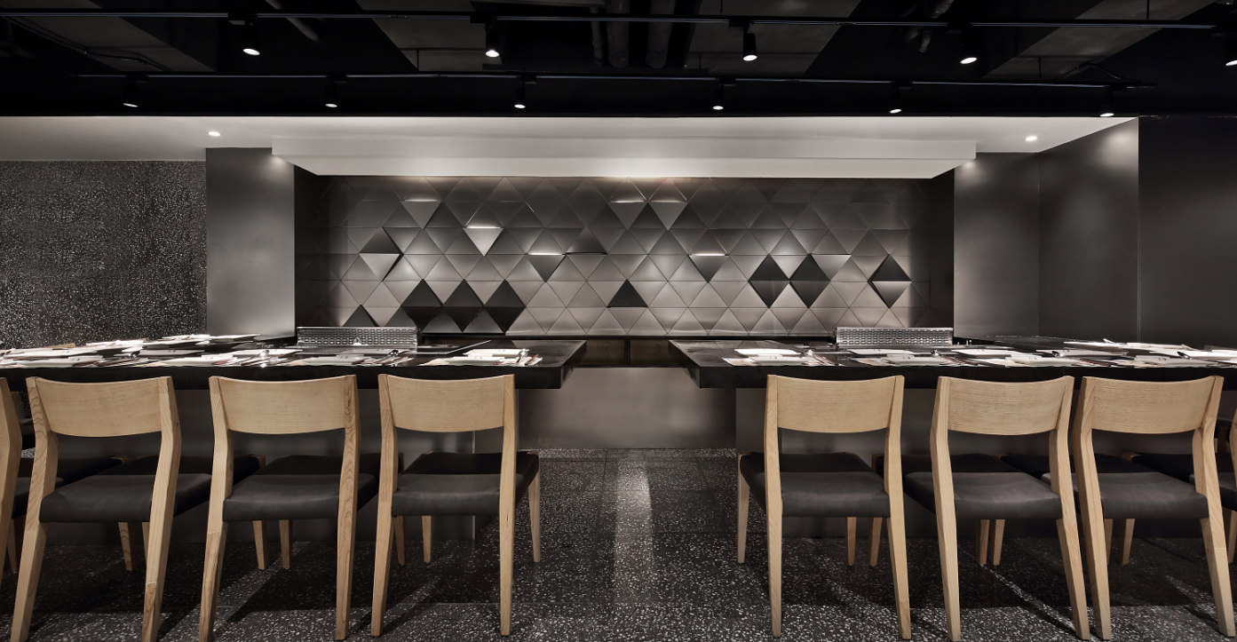 本案位于深圳中心城(很有緣,深圳也叫:鵬城),前身是貝帝設計十余年前的設計作品,此次改造升級,客戶期許有所突破,營造全新的格調氛圍空間?;谌绱嗽V求,貝帝設計師以大漁的LOGO為靈感來源,通過分解魚頭形狀,進行鏡像、組織,以三角形體的形式呈現在空間里,應用現代手法打造了一個簡約、日式、略帶商務風的空間。