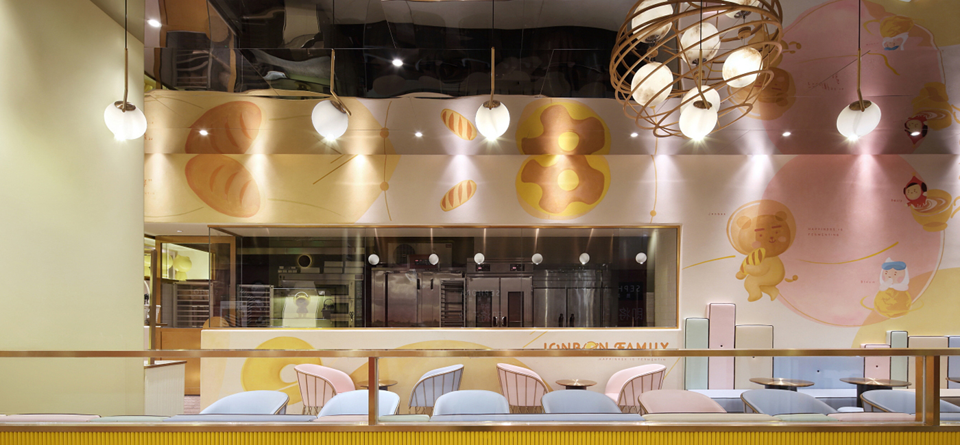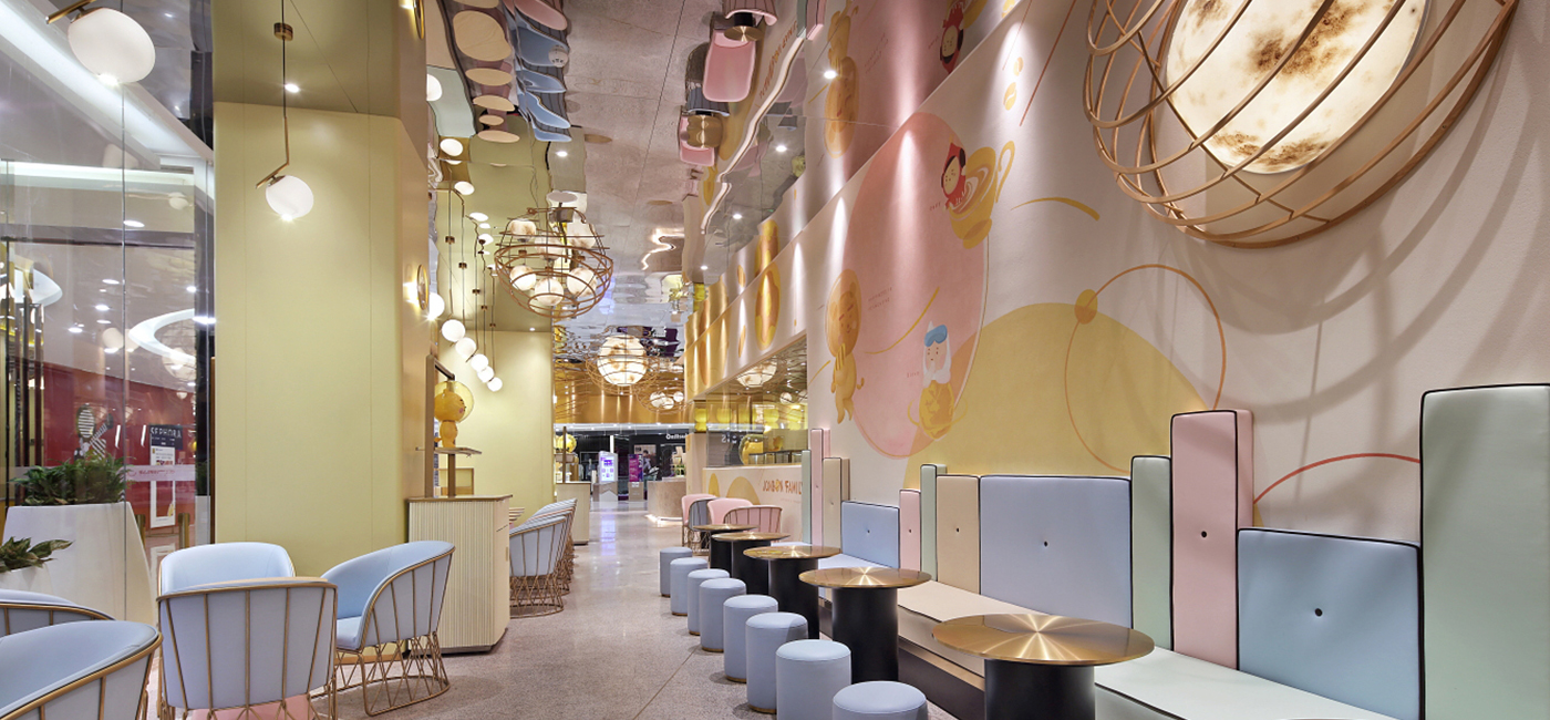 豐富亮眼的彩色座椅和醬寶與星球故事的墻繪,讓原本單一的空間變得溫暖,多了一分煙火氣息,呈現(xiàn)給顧客有趣而溫馨的感覺。
