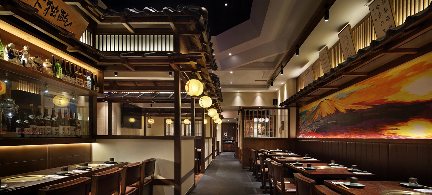 浪杯萬和牛燒肉居酒屋是傳統(tǒng)曰料餐廳和日本街道的探索嘗試,以日本傳統(tǒng)街道的概念進(jìn)行創(chuàng)意布局,仿古屋宇坐落有致。天花上精心設(shè)計(jì)屋檐造型,灰瓦、櫻花、曰式紙傘裝飾上空,客人穿行而過,仿佛置身于明治時(shí)代的古街老巷,隨性入座,享受大隱于市的生活別趣。