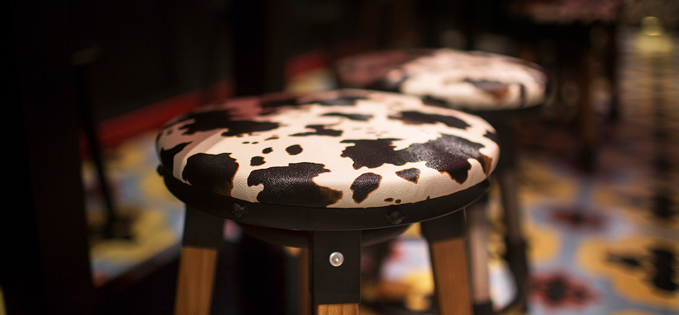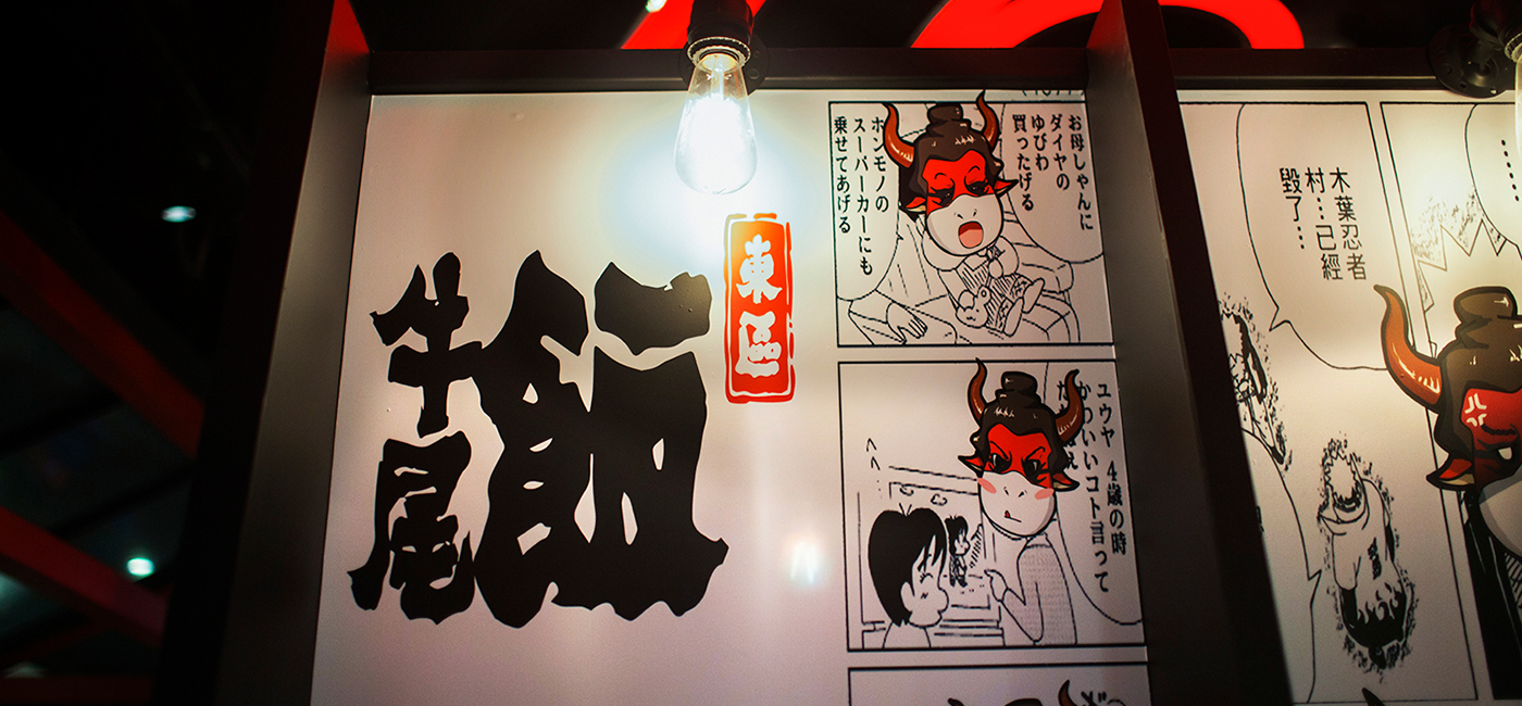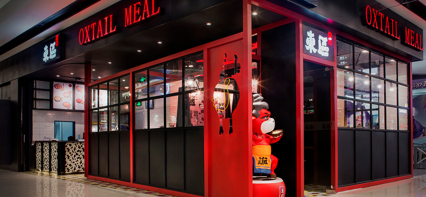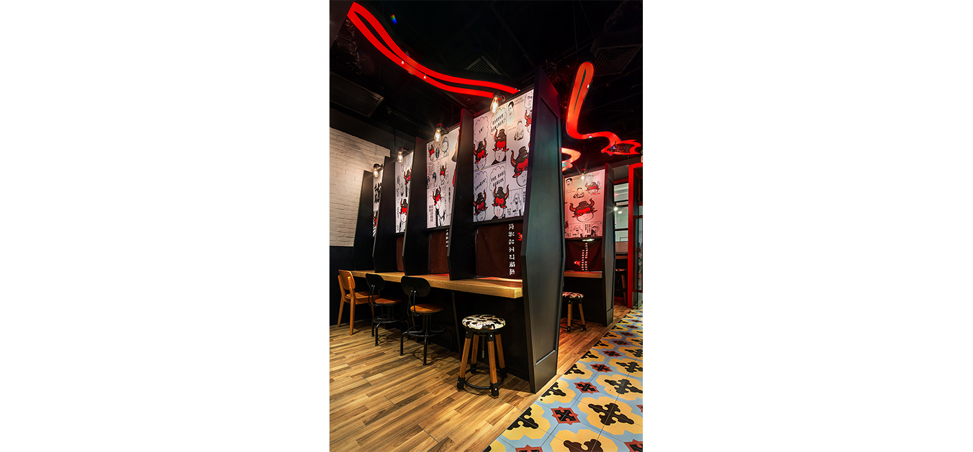 時尚大都市是人們所向往的繁華、熱鬧集中之地。這次現代簡約風格餐廳設計圍繞大都市的題材做文章,以強色彩對比色調來強調傳統文化視覺感,以中國建筑結構斜頂來表現牛棚,產生新奇感,并且巧妙融合產品牌文化。店內的現代簡約風格餐廳設計是使用牛文化因素來打動牛尾飯客人,設計師在店內天花板上運用鮮明的牛尾巴設計來點明空間主題。