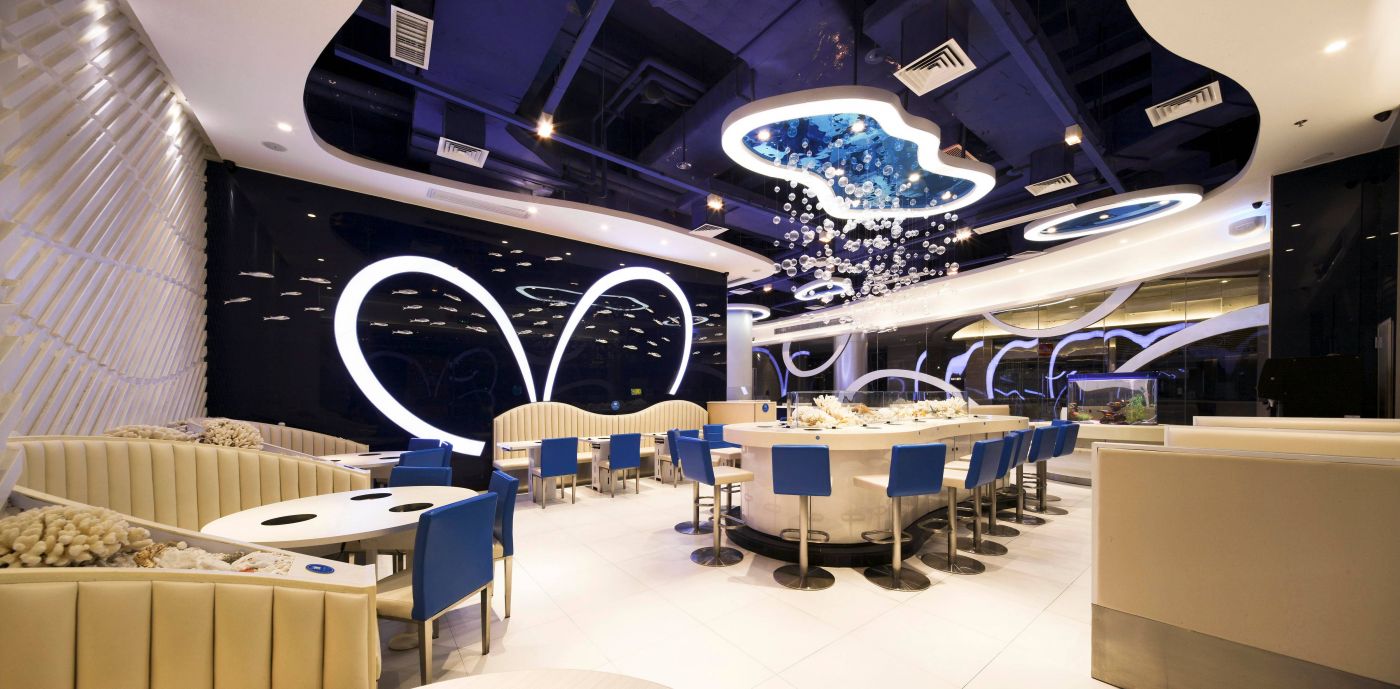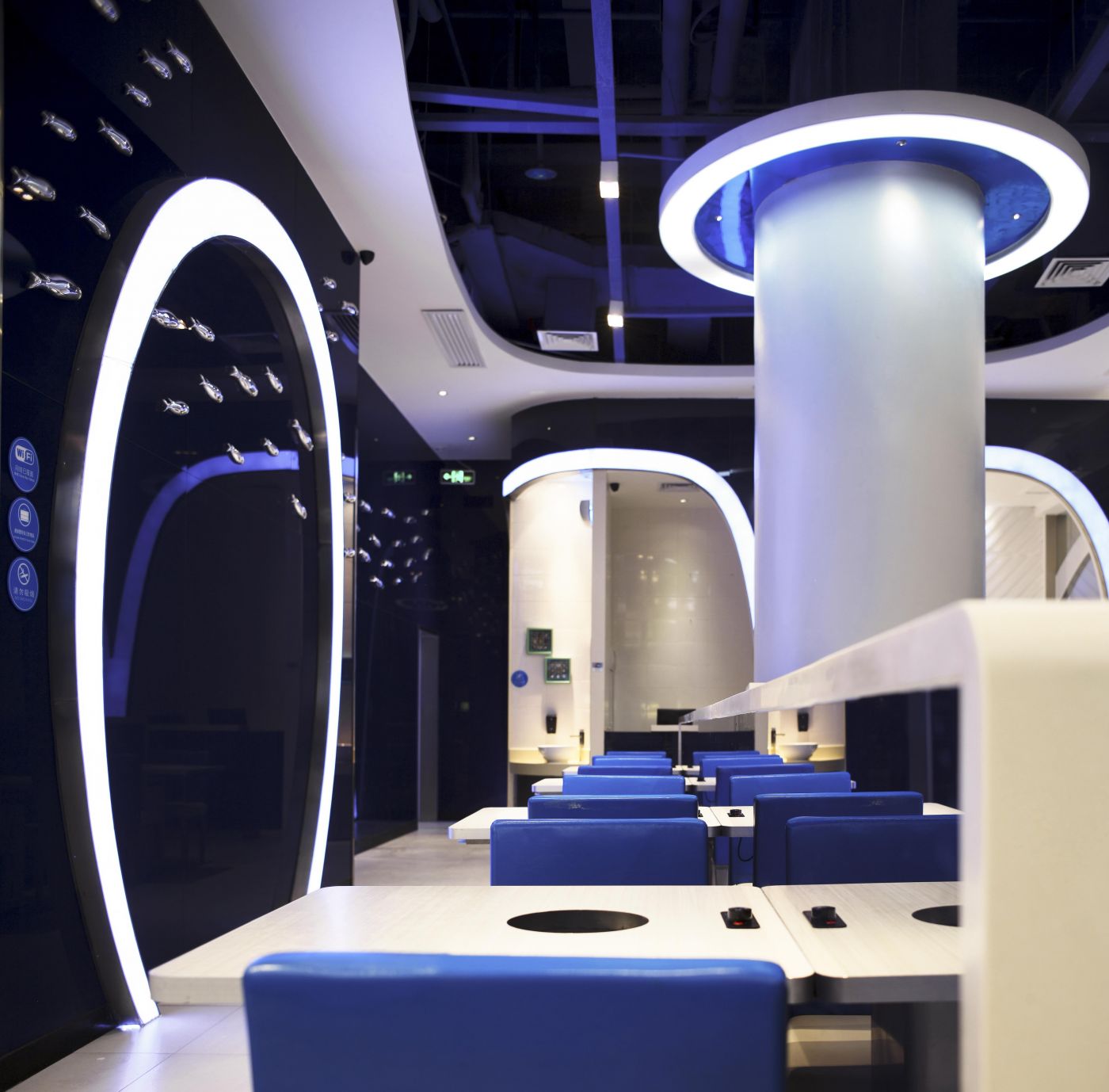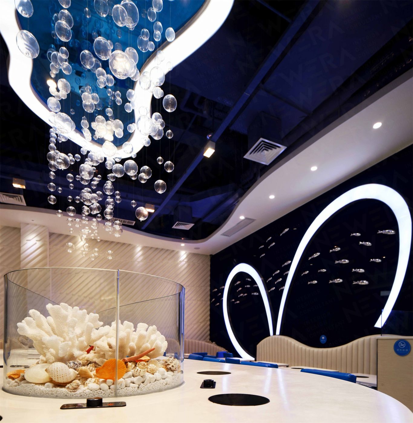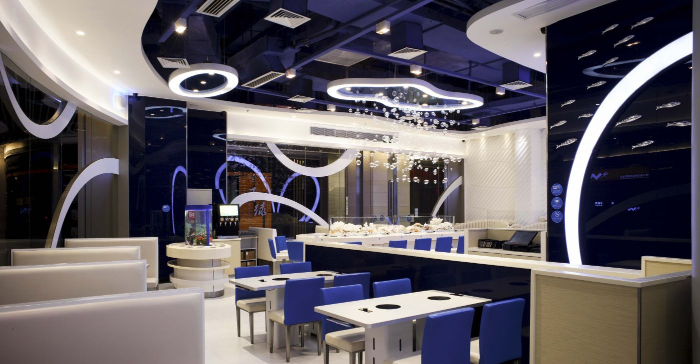 走進海平面,屬于沙灘的米白色與屬于大海的深藍色撲面而來,整個自助火鍋店設計色調簡單而極致,仿似搏浪一般的吊燈、餐桌椅造型、藍色的椅背、墻壁上“魚群”、再加上藍色燈光下的一串串“氣泡”裝置與身邊隨處可見的珊瑚、海星、貝殼、海螺……值得一提的是,設計師并沒有簡單的將天花用吊頂封閉起來,而是用藍色的薄膜為空間使用者營造了頭頂上的“水面”。
