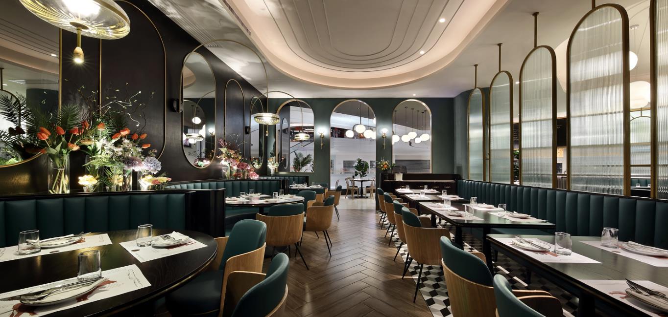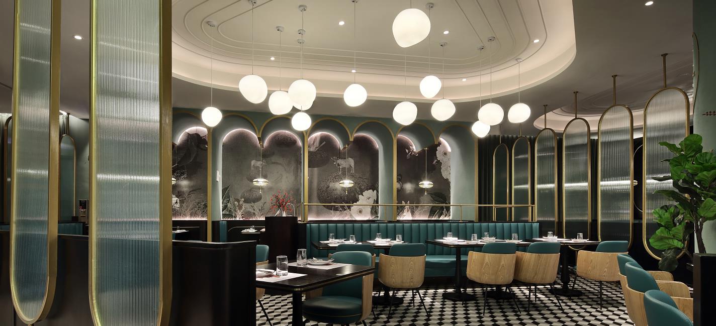 從花園步入餐廳,景色隨地磚的跳躍而變換,空間也漸漸變得精致;鏡面的使用呼應空間,天鵝絨窗簾看上去格調滿滿,錯位屏風賦予空間神秘感和私密性。原石的品牌文化融入空間也很巧妙,天花上的線條衍生自原石品牌圖形;