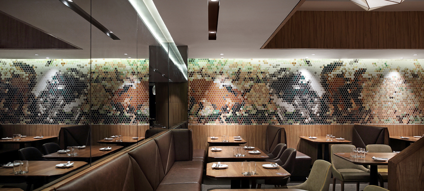 設計師致力將趣味體驗融于空間每一處。小包間設計為樹洞,原木裝飾予以玩味不盡的雅趣。整面墻的六邊形小石磚,制造奇妙的韻律感。石與木兩種材質碰撞,令室內空間飽滿又和諧。