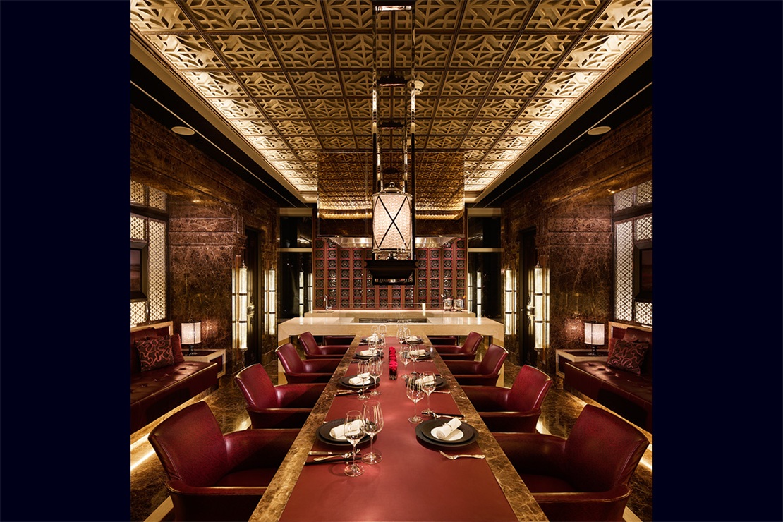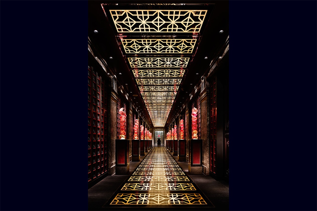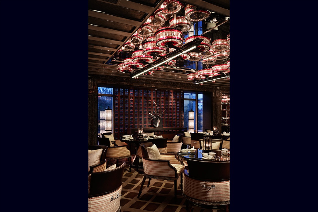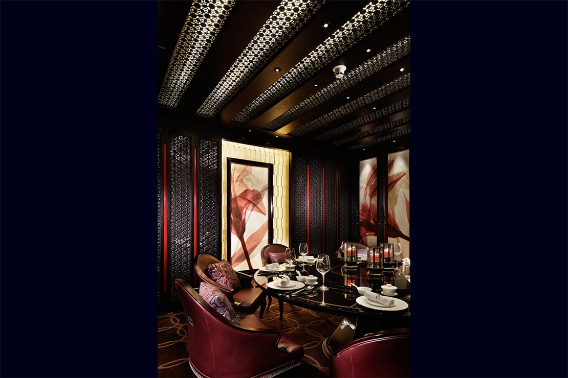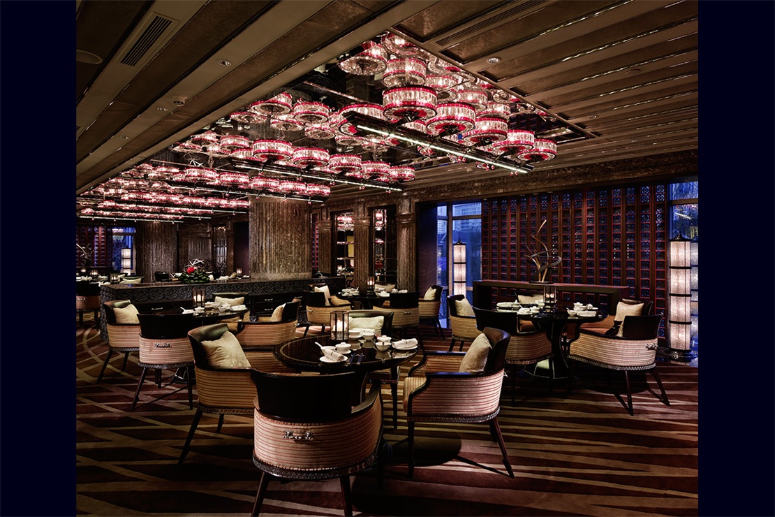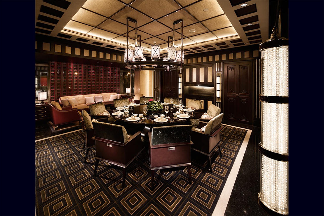 從而提升餐廳的神秘感,在線形結構上也通過應用中西兩種不同的裝飾元素進行曲直結合,比例尺寸拿捏恰到好處,既彰顯古典中式的大氣、雍容、韻味的特點,又糅合了西式裝飾的奢靡、舒適、豪華的優點
