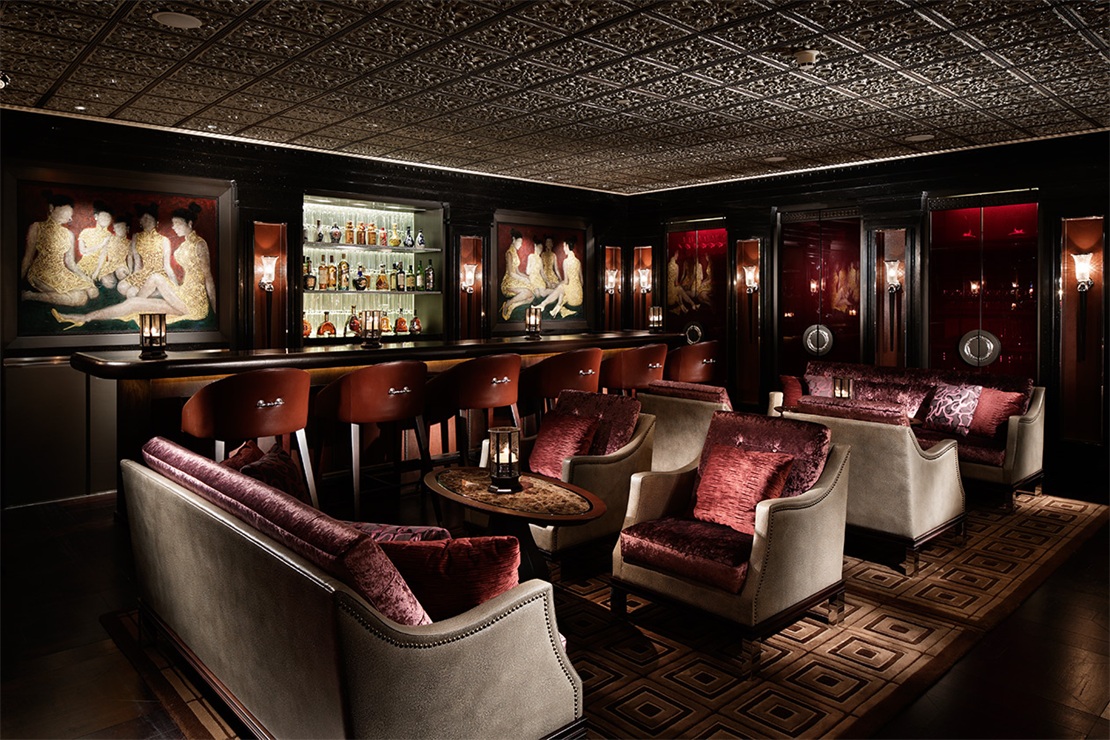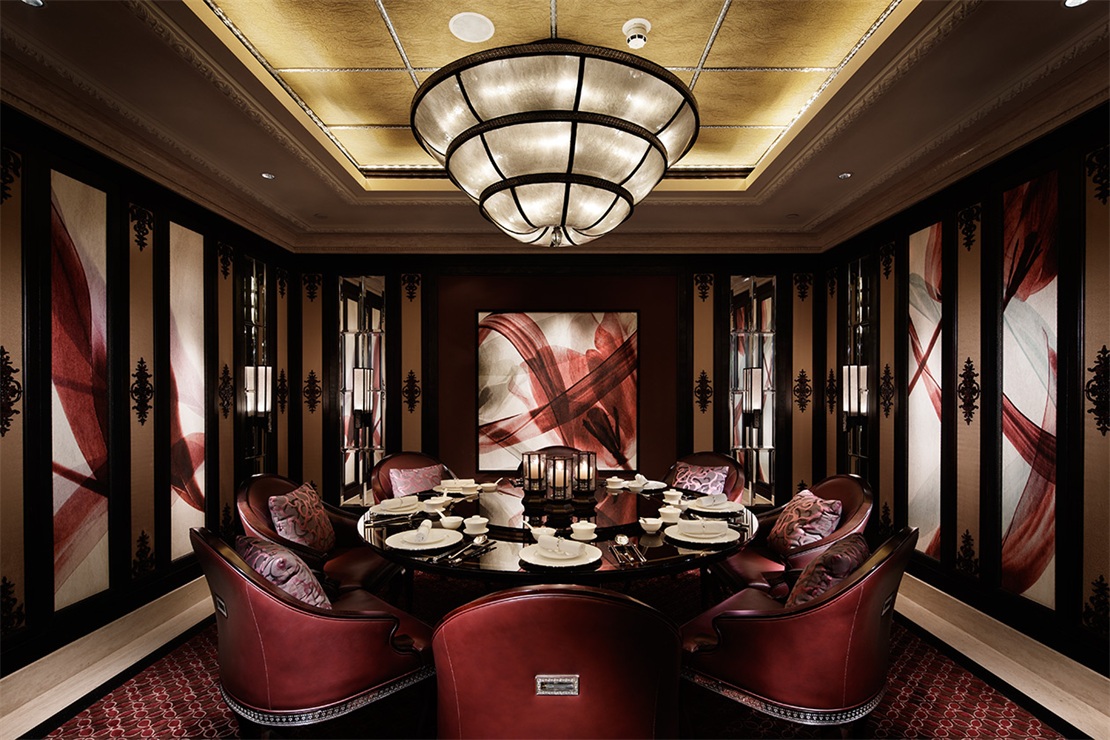 在設計上借鑒了中式主題元素、中國窗、壁畫,但在軟裝的上(天花、地毯、餐椅、餐桌、沙發)采用古典西式搭配,在顏色搭配上大量運用紅暗色系搭配。