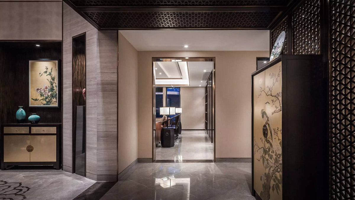 在立面上,設計師用寫意畫的筆觸,輔以深色勾線、淺色帶面,賦予“山”的硬朗。同時,在終飾物料及藝術品中亦融入山水肌理和意向,以“水”之陰柔與其和諧相生。