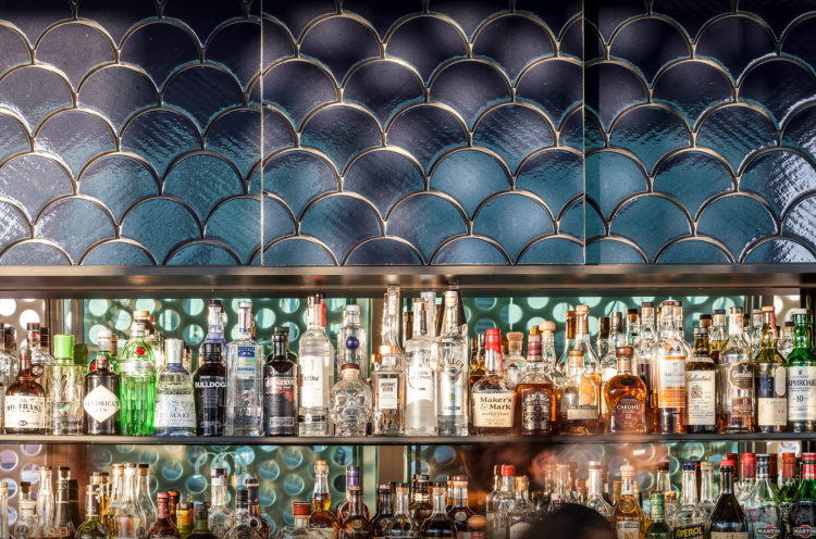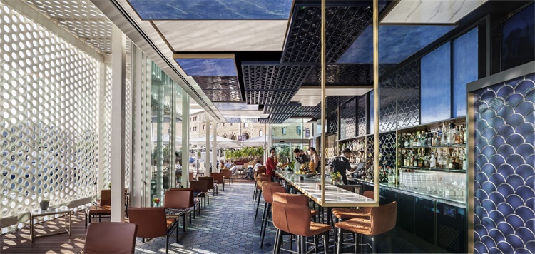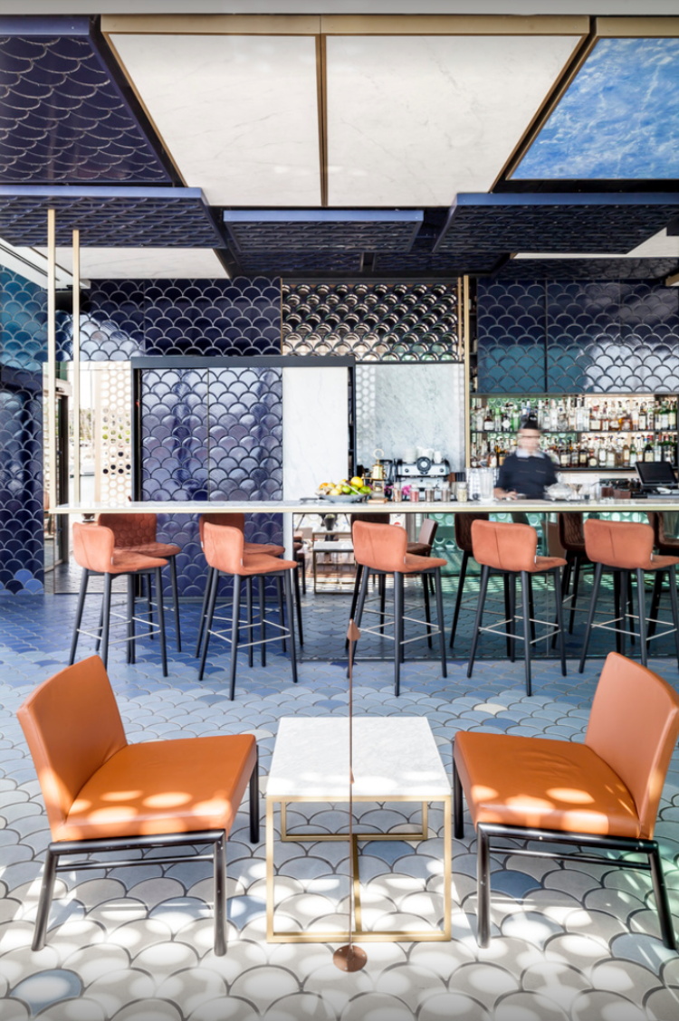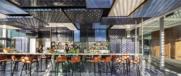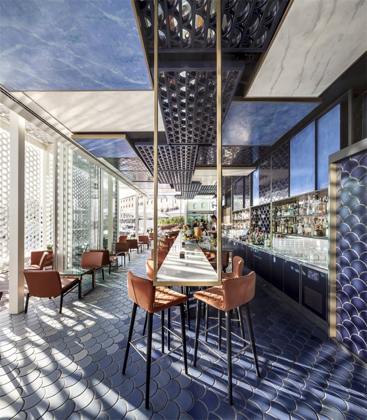 巧妙的利用反射性的、閃光的和藍色的材質,例如瓷磚、大理石板、金屬和玻璃等,設計師讓波浪這個概念在整個空間內延續。陳列的酒瓶是吧臺最顯著的特征,制作吧臺的材質與整個空間極為統一。吧臺也是波浪的一部分,由一塊從天花板懸掛下來的大理石板構成,顧客坐在大理石板的另一邊盡情的享用雞尾酒。