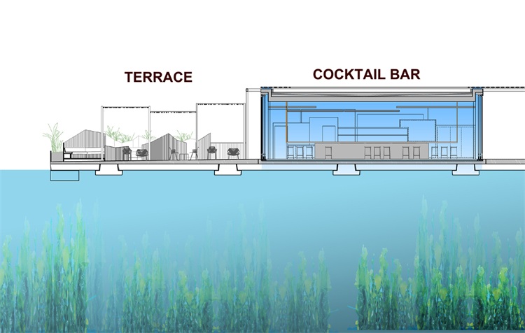 業主首先提出了以下設計需求:能讓顧客在優雅的氣氛中品嘗雞尾酒的同時欣賞到港海的美景。Blue Wave酒吧所在建筑物的形態極為特殊:長邊平行于水面的長條管狀建筑,黃昏時,陽光透過立面的鏤空白色格柵,打造出奇妙的光影效果。