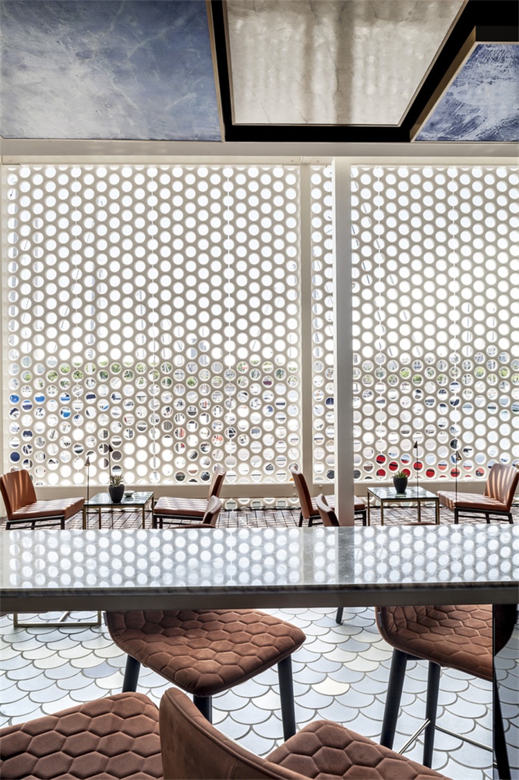 鏤空并且反光的外立面將室內外相連,立面上裝飾的白色的鏤空小格子被視作波浪的一部分。