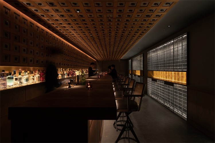 在160平米空間里,長吧臺是絕對的核心。設計師運用了大量溫暖的色調:緬甸柚木,天然牛皮和黃銅等材料。在12米長的緬甸柚木臺面中嵌入3個600x380mm的冰塊托盤,以及6個900x140mm的調酒托盤,可以滿足6-8個調酒師同時工作。吧臺與傳統酒吧的吧臺有許多不同,設計師將所有調酒設備完全隱藏在吧臺下方,避免使用吧臺后面的柜體,保證整個調酒的過程只在吧臺臺面呈現。不僅如此,通過博物館級別射燈的指引,客人可以近距離、沉浸式地觀看調制雞尾酒的全過程。酒保和客人之間因此增加了更有效的交流。溫潤柚木的長吧臺、燈光、酒的香氣以及調酒師的參與,使得整個調酒的氛圍更貼心和私人化。此外,長吧臺區的吧椅也是為這個項目量身設計,選用胡桃木實木、實心鐵做氟碳噴涂搭配印度尼西亞手工編織的六角眼編材料和天然牛皮。