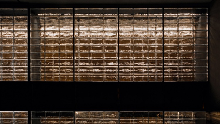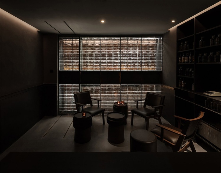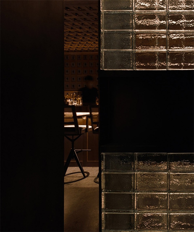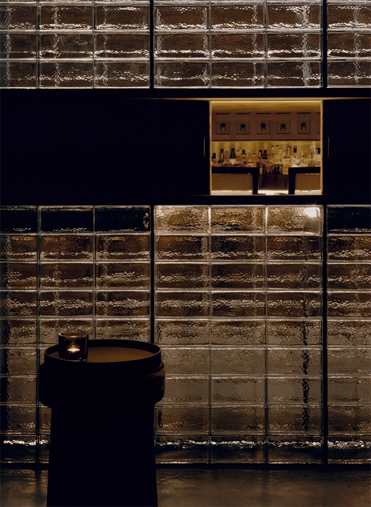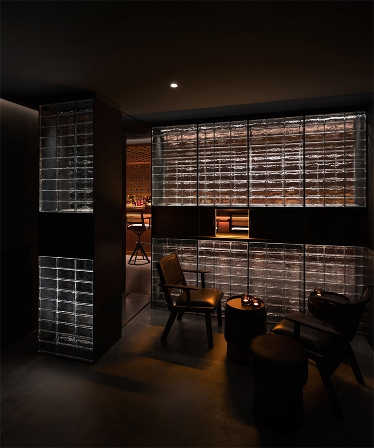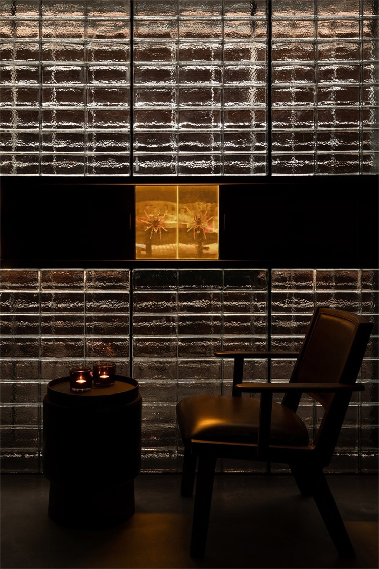 長吧臺對面是一整面玻璃磚墻,將公共區域和其他相對私密的卡座和包間進行了很好的分割,在空間上起到了分割限定的關鍵作用。包間的入口低調地消融在玻璃磚墻上,使之形成整體。實心玻璃磚由5毫米黑色實心鐵分隔組成墻體,玻璃表面呈現手工敲打的圓形凹點,在燈光的照射下折射出豐富而神秘的光。玻璃磚墻正中央鑲嵌了一條由42只巨型泰國捕鳥蛛做成的樹脂琥珀,與對面的甲殼蟲形成一種有趣的呼應。設計師又在玻璃磚墻上嵌入幾個黑鐵抽屜,內部藏著其他稀有漂亮的昆蟲琥珀標本:甲蟲科、蜣螂科、花金龜科和臂金龜科。當客人坐在卡座喝酒時,還可以打開這幾個黑鐵抽屜作為小桌板使用。
