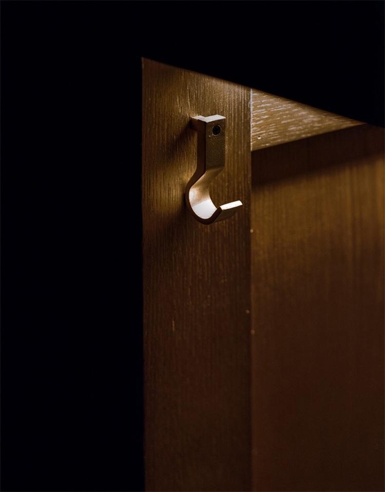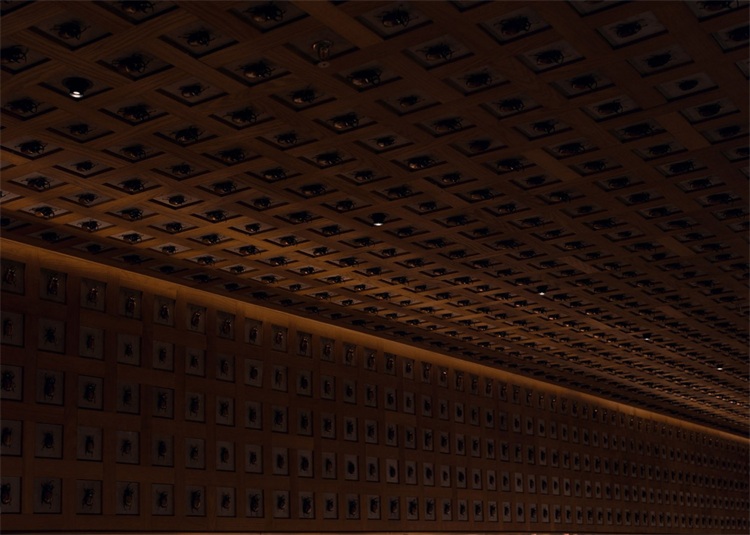 休息室沿墻面設置了長長的牛皮卡座,設計師為該項目量身設計了活動家具,這些扶手椅和圓形蹲座,以煙熏色胡桃木搭配深棕色牛皮和馬毛,搭配黑色金屬配件。空間以灰色橡木做舊木板和深灰色馬來漆為主要材料。空間和家具整體顏色相近、富有質感、氣質低調,暗調燈光和玻璃墻光影糅合成為一種奇特的、安靜而神秘的氛圍。休息室里最顯眼的莫過于一整面滿鋪的蝴蝶標本墻,36個道具,每個道具里擺放一只蝴蝶,從道具底部安裝極小光源照亮蝴蝶,立體感使之栩栩如生。蝴蝶標本墻下方也安放了幾個長條形抽屜,完全不同科目的昆蟲標本安靜地趴在黑色天鵝絨上,等待被下一個好奇的人發現。
