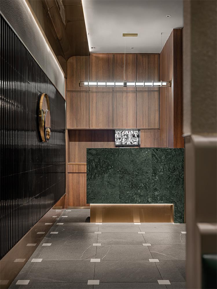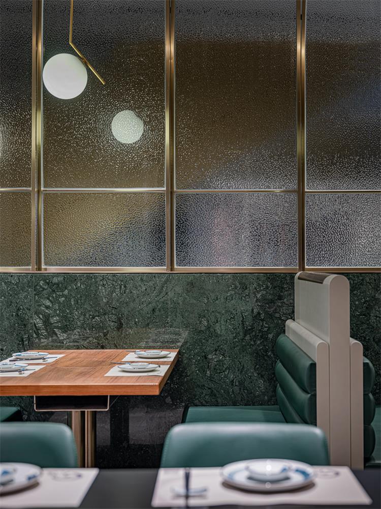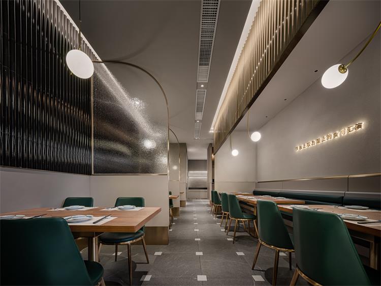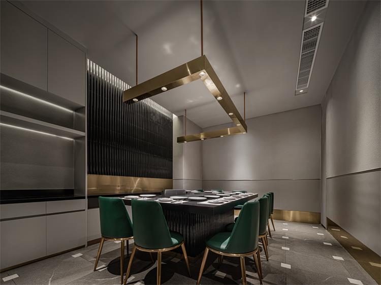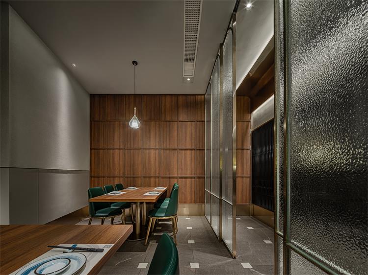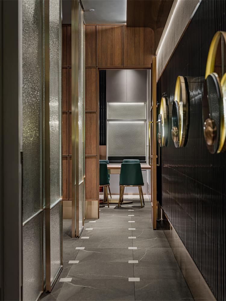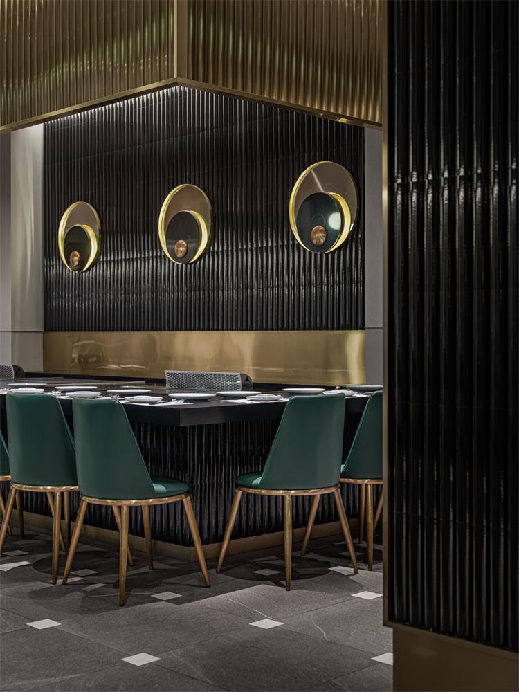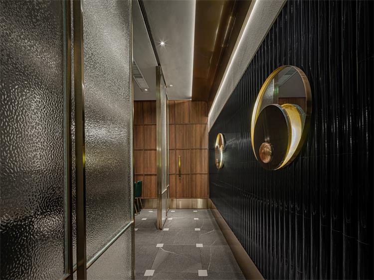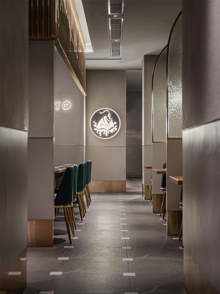 輕奢氛圍營造恰到好處,細(xì)節(jié)處也有巧思。如地面,來自東方的榫卯元素融入瓷磚接縫處;立面收納柜有木紋防火板的溫潤自然調(diào)劑氛圍,使空間不至于太冷。包間墻面的肌理襯托出大漁logo的低奢貴氣,水紋玻璃和不銹鋼搭配,讓隔斷在劃分空間布局的同時(shí),又互有趣味連通。大漁除了精準(zhǔn)的輕奢氣質(zhì)拿捏,無處不在的海浪弧形元素也賦予空間統(tǒng)一性。