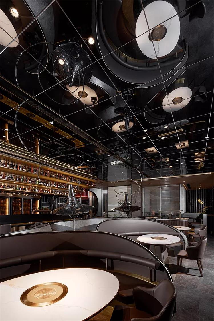 鏡面透過光影交織,產(chǎn)生似水如鏡一樣的清澈柔亮。座位設(shè)計成弧形半包圍的形式,打造得非常具有藝術(shù)氣息。