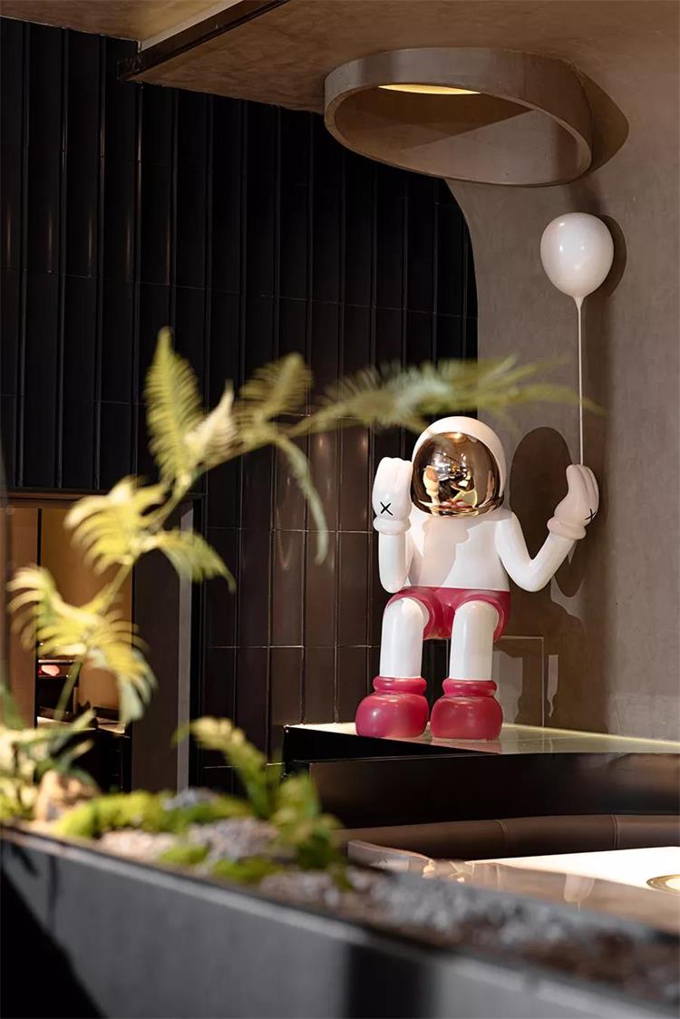 空間中庭的陀螺藝術(shù)裝置,以其精致的金屬質(zhì)感,配合頂部的鏡面處理手法,提升了空間的靜謐氛圍,不僅有顏值,還有品質(zhì)。
