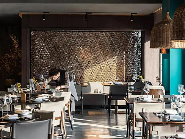 在開放就餐區(qū)里,竹子、藤條經過編織形成不同形態(tài),作為屏風、屋面裝置、吧臺等等,簡潔的同時又具整體感,利用質樸材料本身創(chuàng)造細節(jié)中豐富的精致。