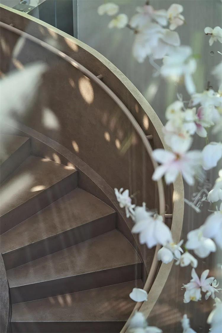 以灰白色水泥作為主基調來襯托鮮花的艷麗,卷曲的形體連接了不同的空間,空間中的曲線引導,穿過天花板、墻壁和地板,營造出一種輕盈的感覺。