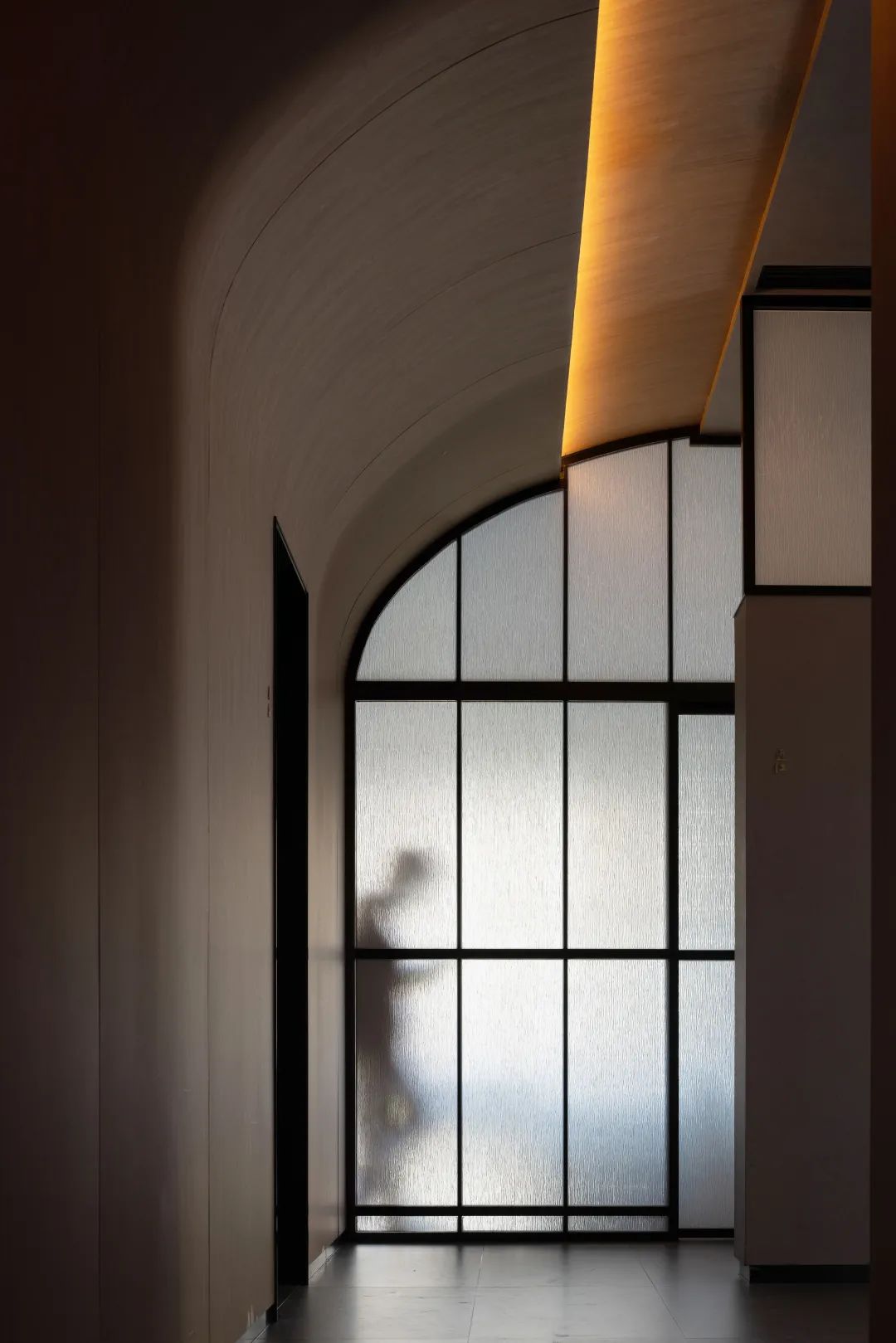 通往包廂的通道空間本狹長逼仄,設計通過兩個維度的曲線,在解決通過體驗單調的同時,表達出含蓄恭謙的迎客姿態;隨空間不斷拉伸的曲線,形體的搭接猶如手作食材雙手捏合,映射出專注、重復、堅持的匠人精神,對美食敬畏的神思之境,走道的盡頭是包房的藝術玻璃隔斷,金黃色的日光透過玻璃淌入幽暗的室內,光感的朦朧靜溢似乎有著某種神性的存在,喚起人在當下一刻的感受和沉思。