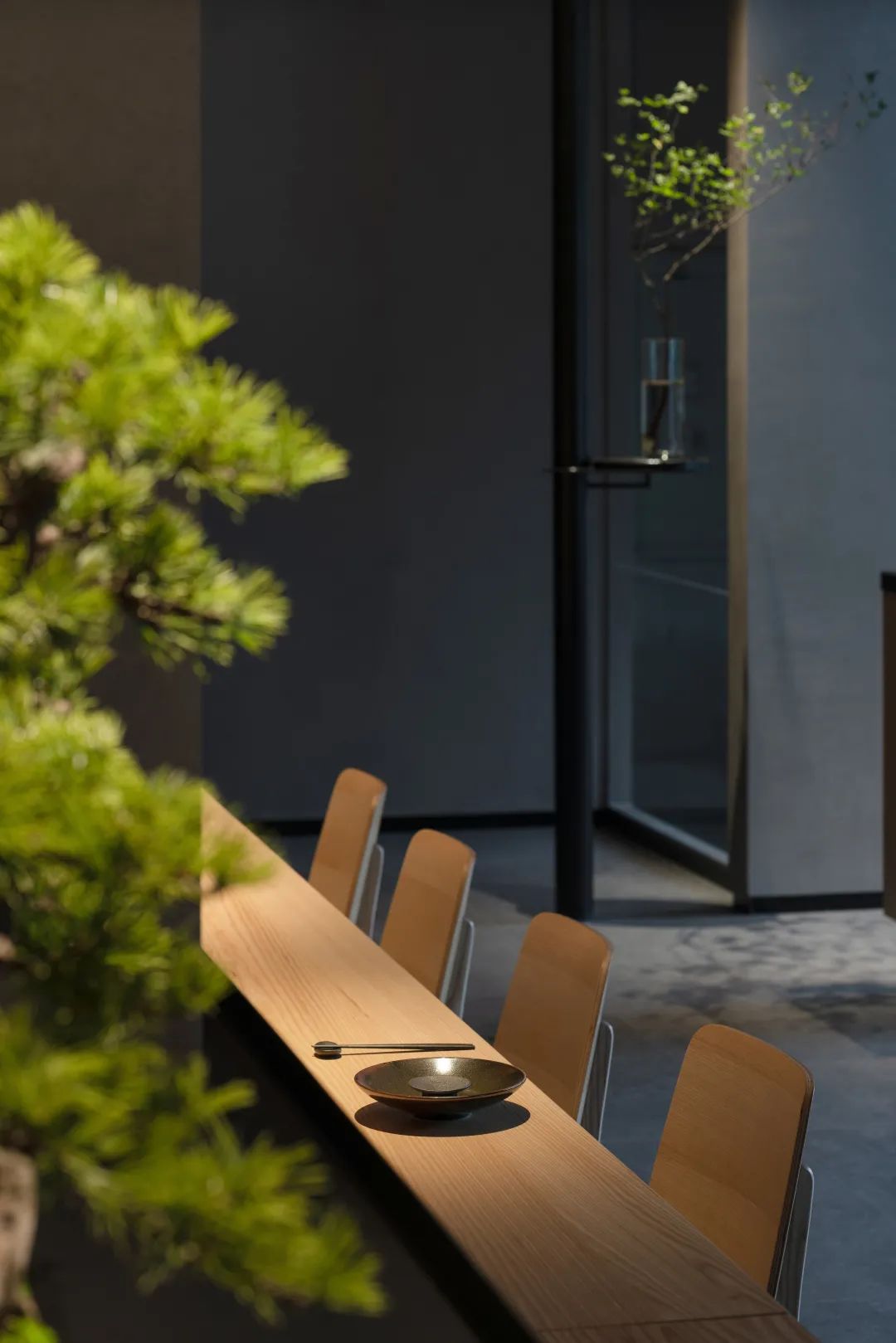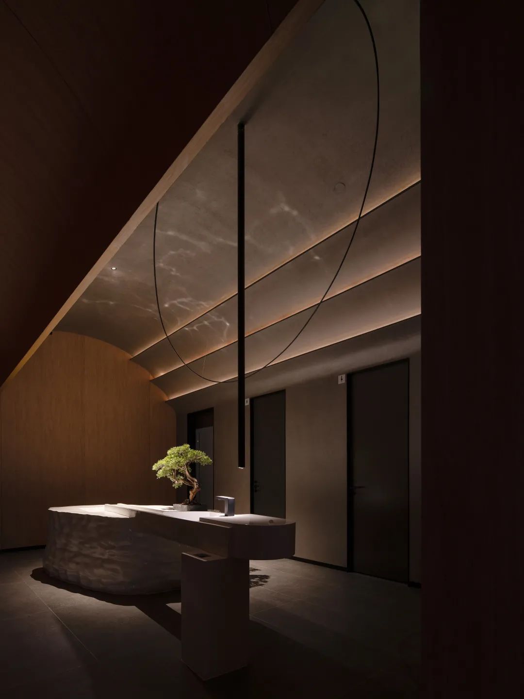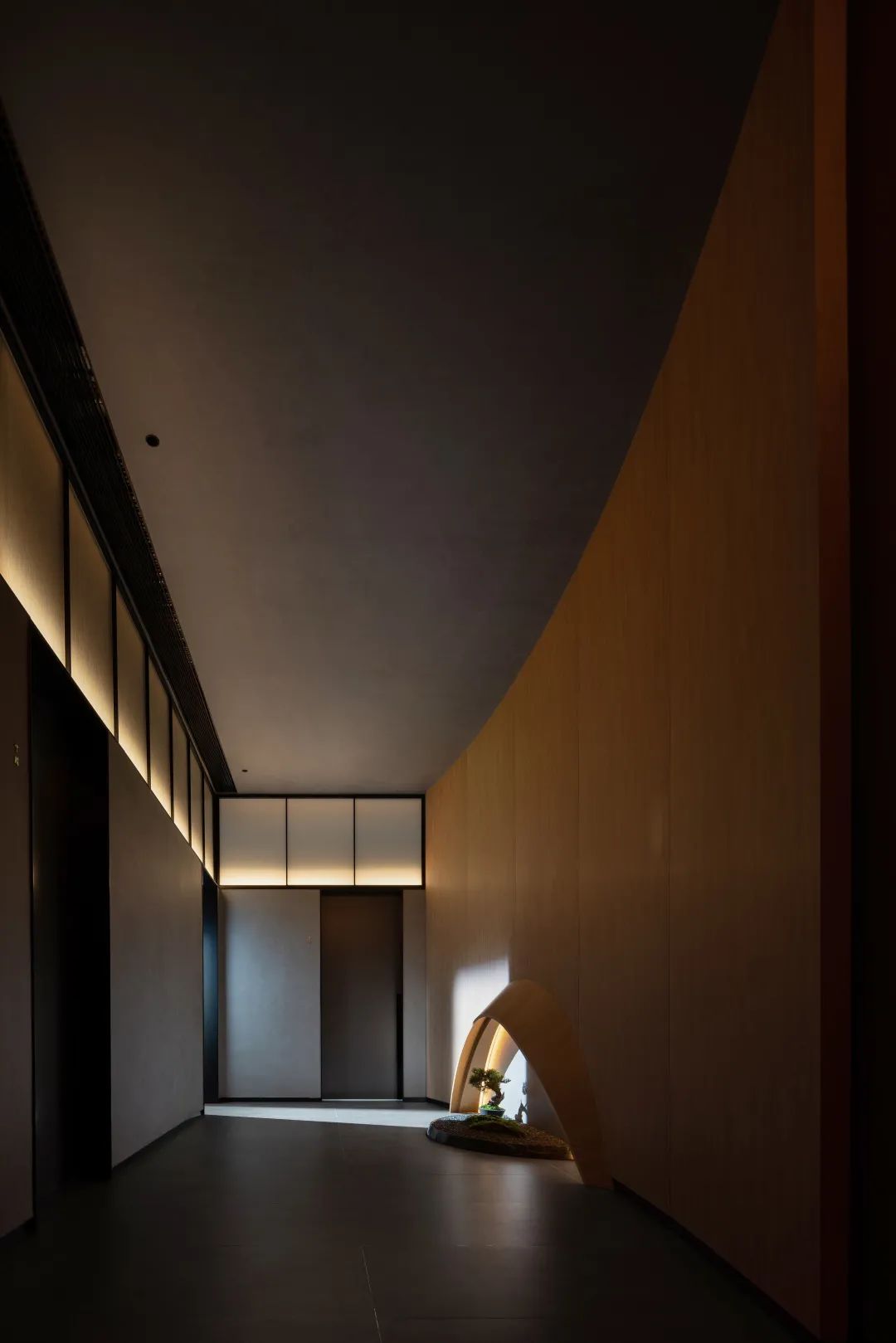 經過通道前往包廂,墻面的弧形壁龕與落地盆景形成一立一平的兩段弧形,通過光感勾勒輪廓,抹亮如漆器般深沉樸素的存在,靜適而嫻雅。而當日光不斷變換投射角度,礫石與盆栽則將光線含吮其間,落在墻面上吐納出濃淡變化之美,惹人思忖。——當我們以自然之手,從一無所有中創造出物與自然的關系時,這種美則有了生命。