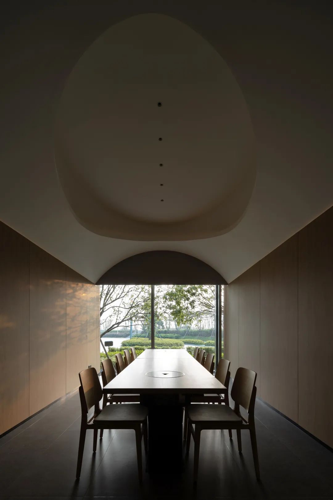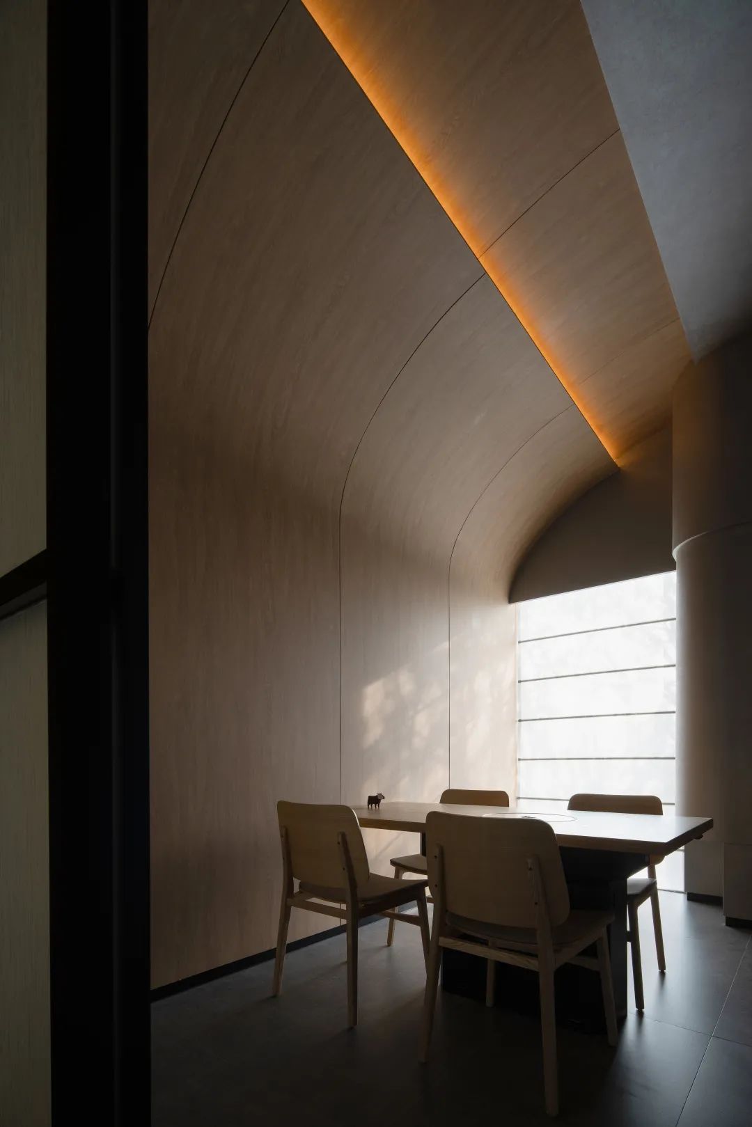 進入包廂內,雙曲面穹頂的神秘與高度,營造出就餐的儀式感;曲面繼續延續到克制的落地窗,適度內隱退讓了室內與外界物景的關系,以更適合人們安靜的接納自我的心性,并專注于美食的體驗。