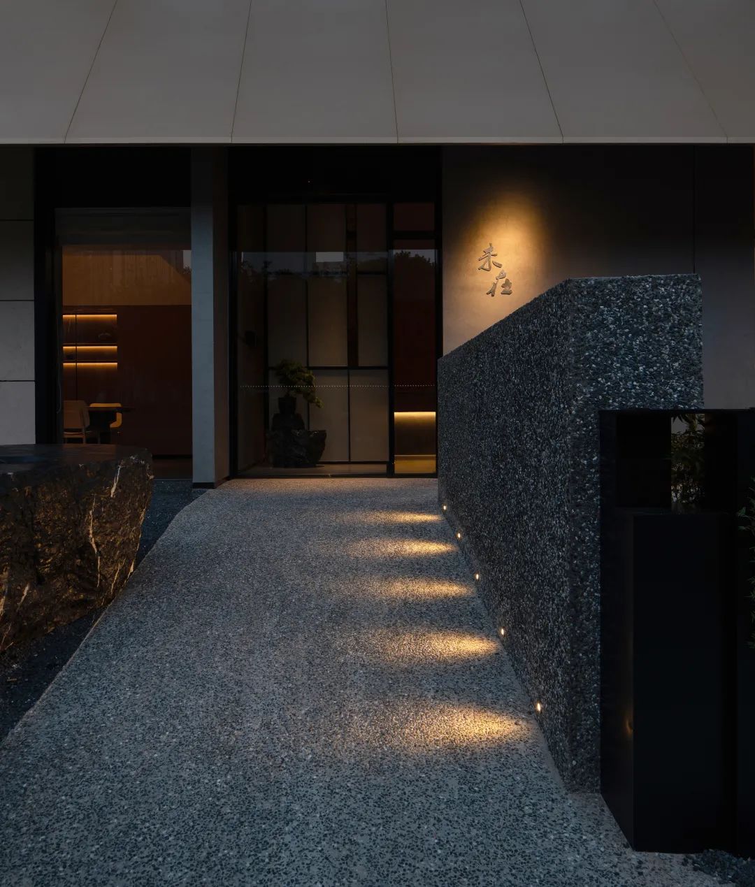 當人來到或經過庭院時,地面和景墻做了水洗石處理,這種懷舊的肌理會帶給人輕松舒適。傾斜低壓的屋檐,形成入口處的扁口過渡性空間,拉低的尺度增加了場域的親和性,人們可以在這里停留、做短暫的交流,在觸手可及的屋檐下,一棵黑松傍石而立,樹下苔蘚蔓繞,礫石滿鋪。庭院雖小而美,卻有著鮮明的自然四季的變化,和近在咫尺的流光溢彩車水馬龍都市生活形成強烈對比。