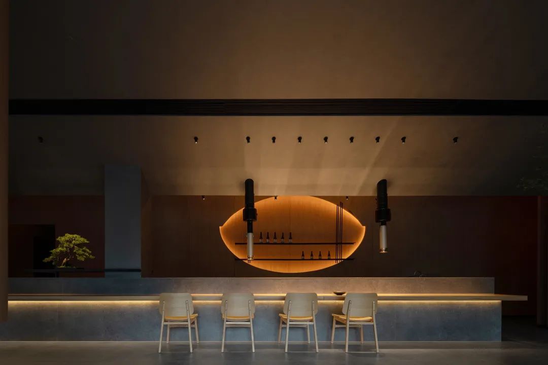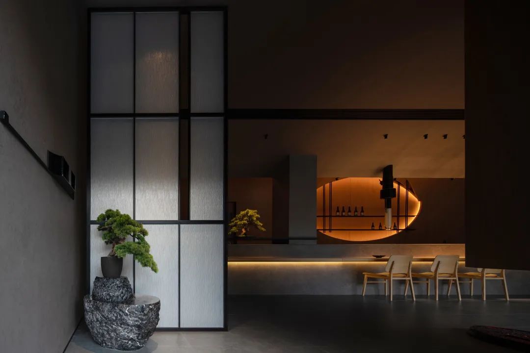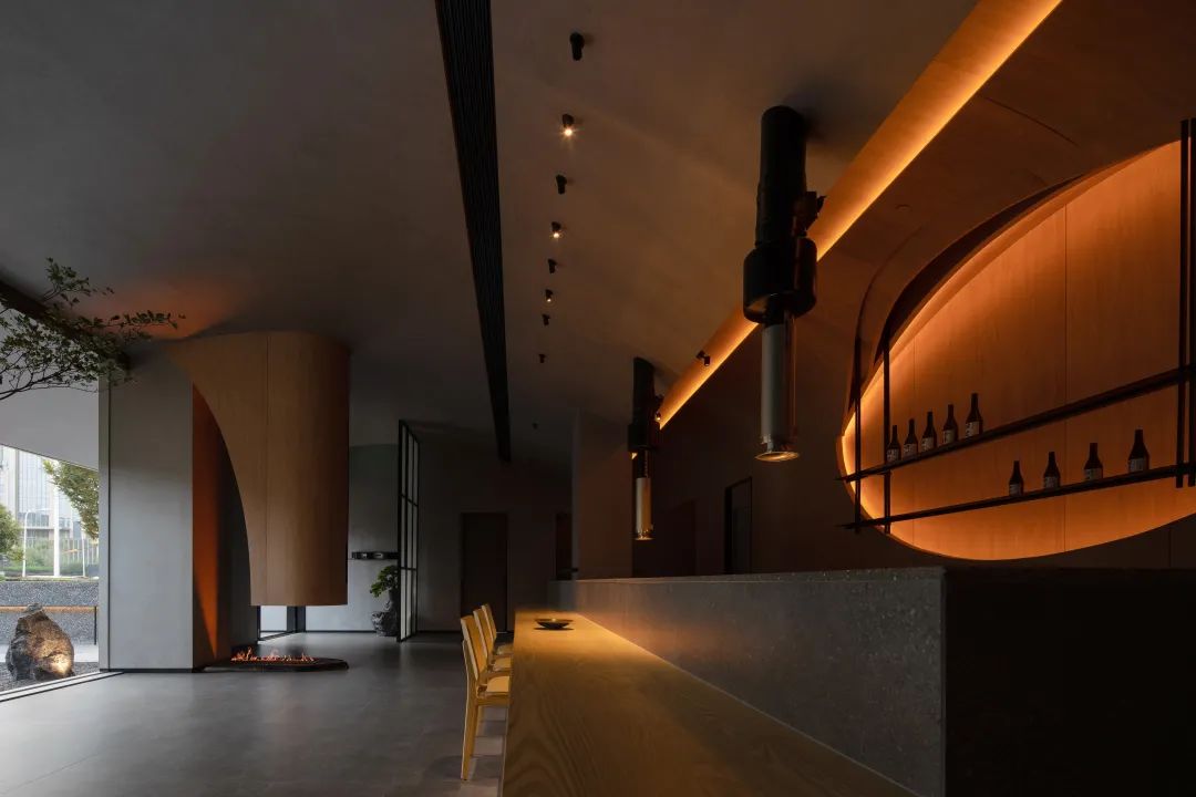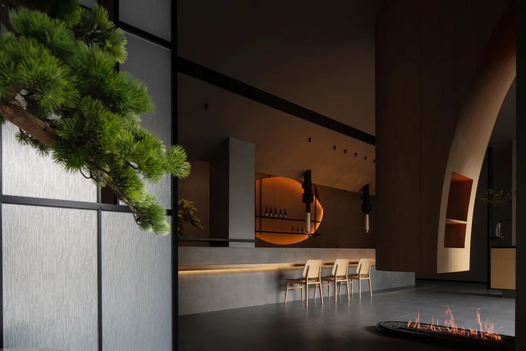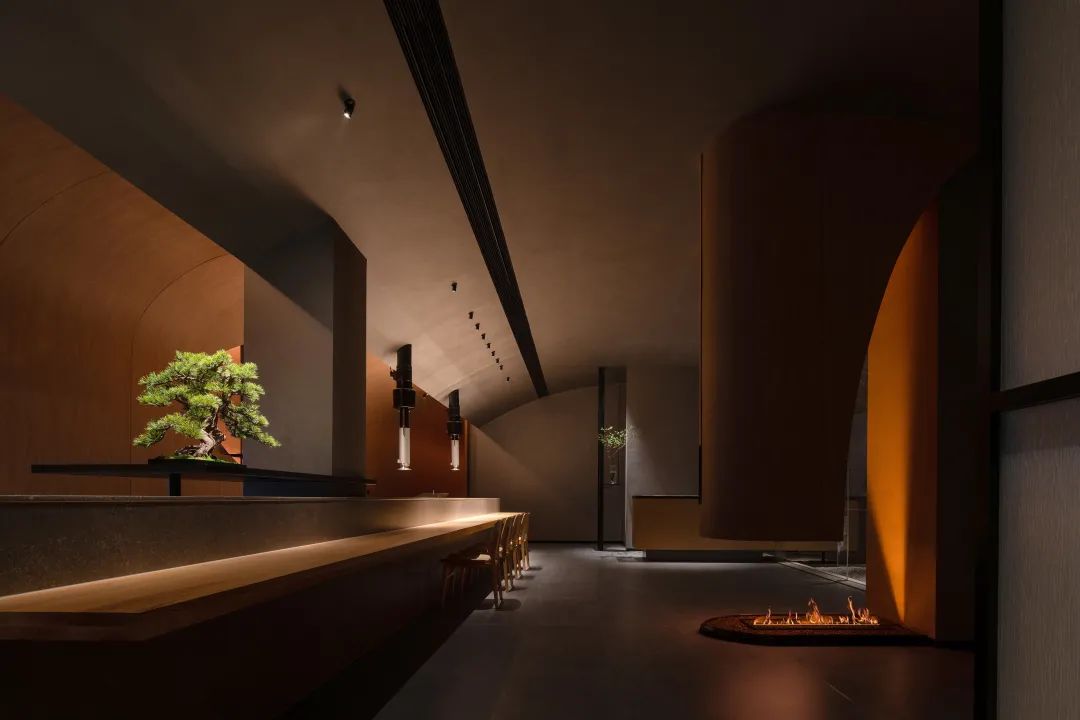 進入大廳,玄關的紙質質感的藝術玻璃映襯地面的火爐裝置,涌動著光與熱的明暗交替,木質肌理的臺面與吧臺,提升了近距離接觸的溫度與舒適感;而地面與天花的曲度、盆景容器的材質則透出陰與涼,內收與謙恭。兩者將東方美感特有的一體兩面,陰陽相生融合在一起。——正如懷石炭火燒的料理藝術,食材在火炙下透出的光澤,在深色陶瓷器皿里融入的溫和。