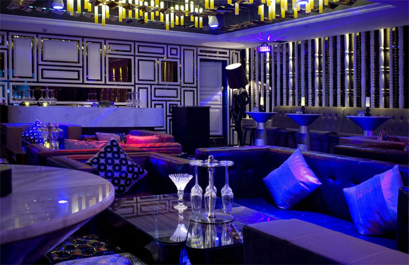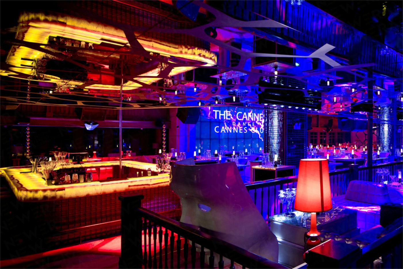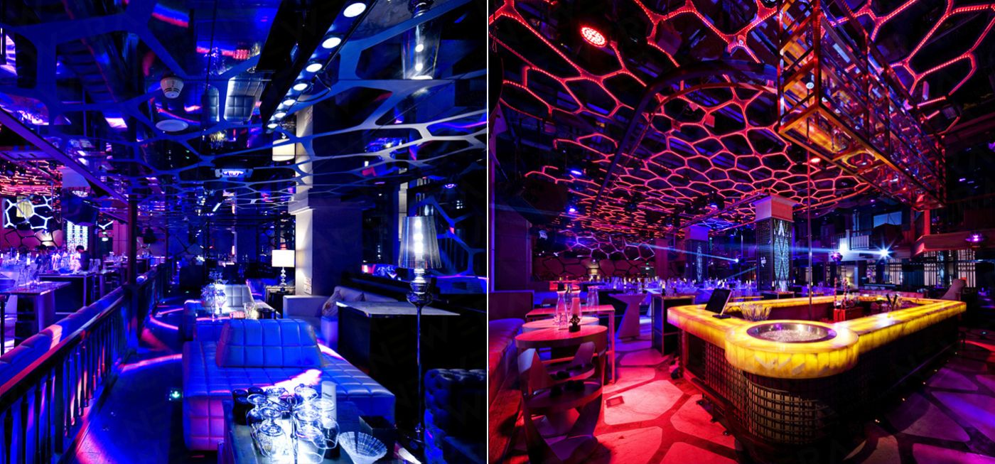 設計師將康城酒吧大廳內空間設計得豪邁通透,頂棚使用黑鈦金與氟鈦漆的材質混搭,造型上以無盡蔓延的不規則圓形呈現,與亂型貝殼狀網貼基面交相呼應,營造出一種水波般的動感。卡座與散座區域使用現代鐵藝欄桿作簡單隔斷。開放式的空間是外向的,它可以產生一種開朗、活潑、接納的心理效應,給夜場空間帶來強烈的趣味性,同時更好地滿足娛樂空間內人群高流動性的基本功能需求。