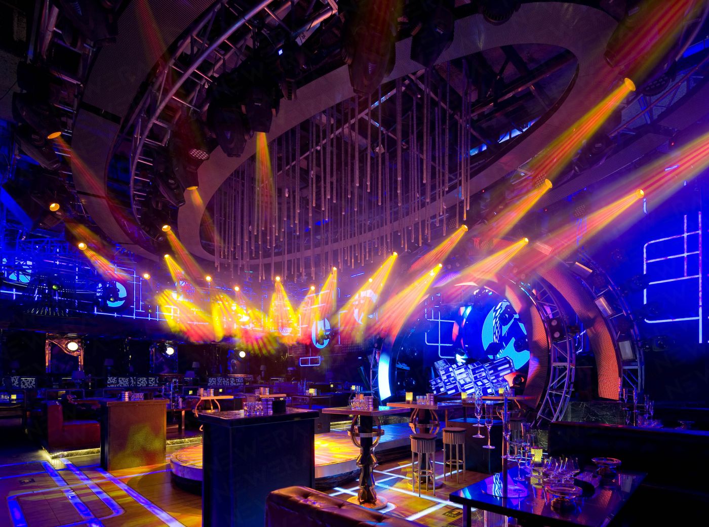 包圍式舞臺設計,配備美國ADJ燈光配合第四代旋轉燈光控制系統,DGX科技P4級異形Led屏幕陣列,在傳動中帶給您時刻驚喜的動感享受。切身體會舞臺從天而降的驚喜。強烈視覺沖擊力的線條和充滿激情的色彩加上迷幻陸離的燈光設計,讓設計師嫻熟的設計思想和手法穿梭彌漫游弋在整個醉夢空間。