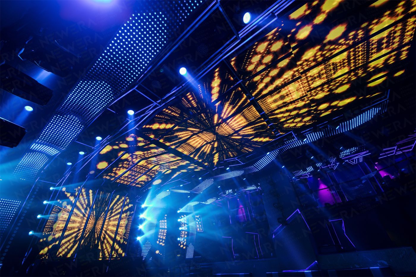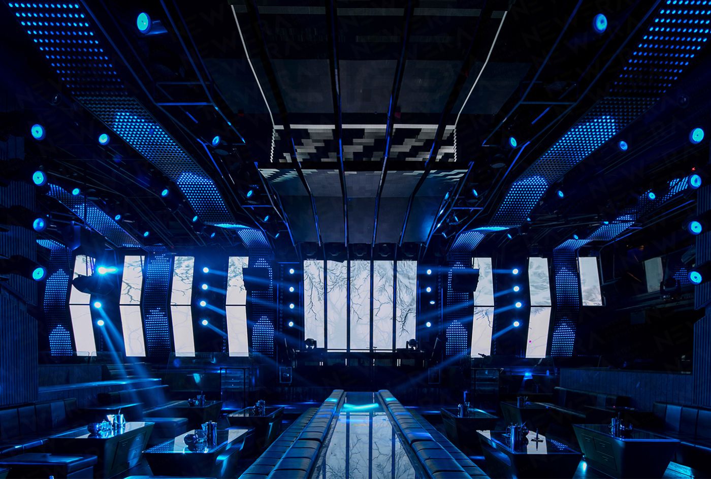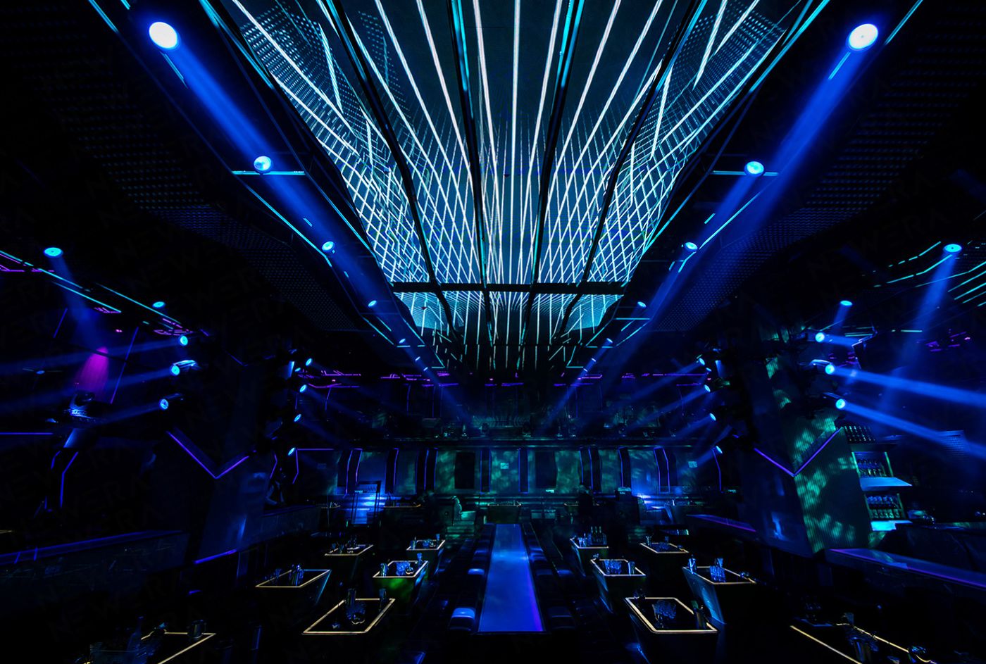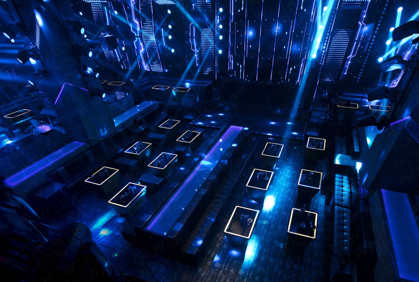 在具體設計階段,設計師選擇新立體主義風格,打破次元,從造型、燈光、視覺體驗上營造未來感。從酒吧外觀、玄關處以及酒吧主體區域,都能看到錯落的造型,輔以冷色調燈光的修飾和搭配,讓人有種從現實世界驟入虛擬空見的錯覺。其中,以折疊光帶為設計元素的外立面是點睛之筆,它能迅速抓住顧客的眼球,把人帶入這個亦真亦幻的空間。為了讓各個空間有區隔又不失整體性,設計師以不同空間體量大小變化來豐富酒吧整體氛圍,比如應用了中心氣氛卡座、半開放式水吧等。