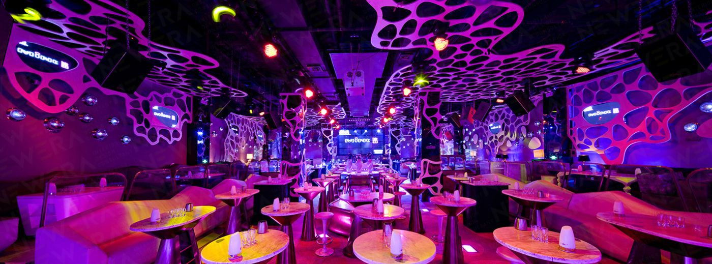大廳中的散臺與卡座依次排開,但是更吸引人的是充斥著整個空間的不規(guī)則幾何圖形,在光影的營造下,既滿足了空間造型的需要,也滿足了功能的需要。