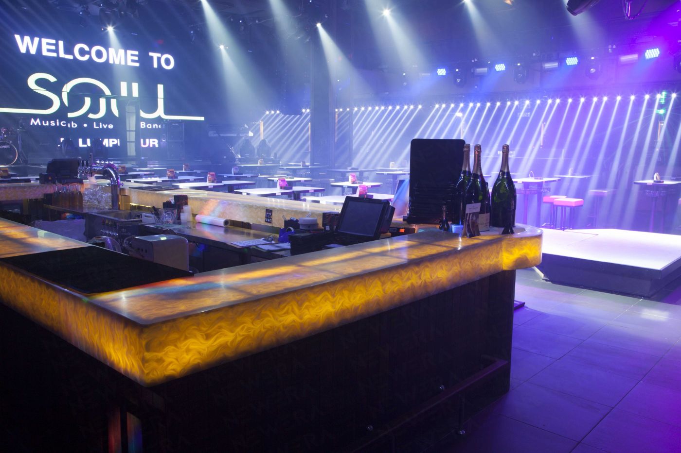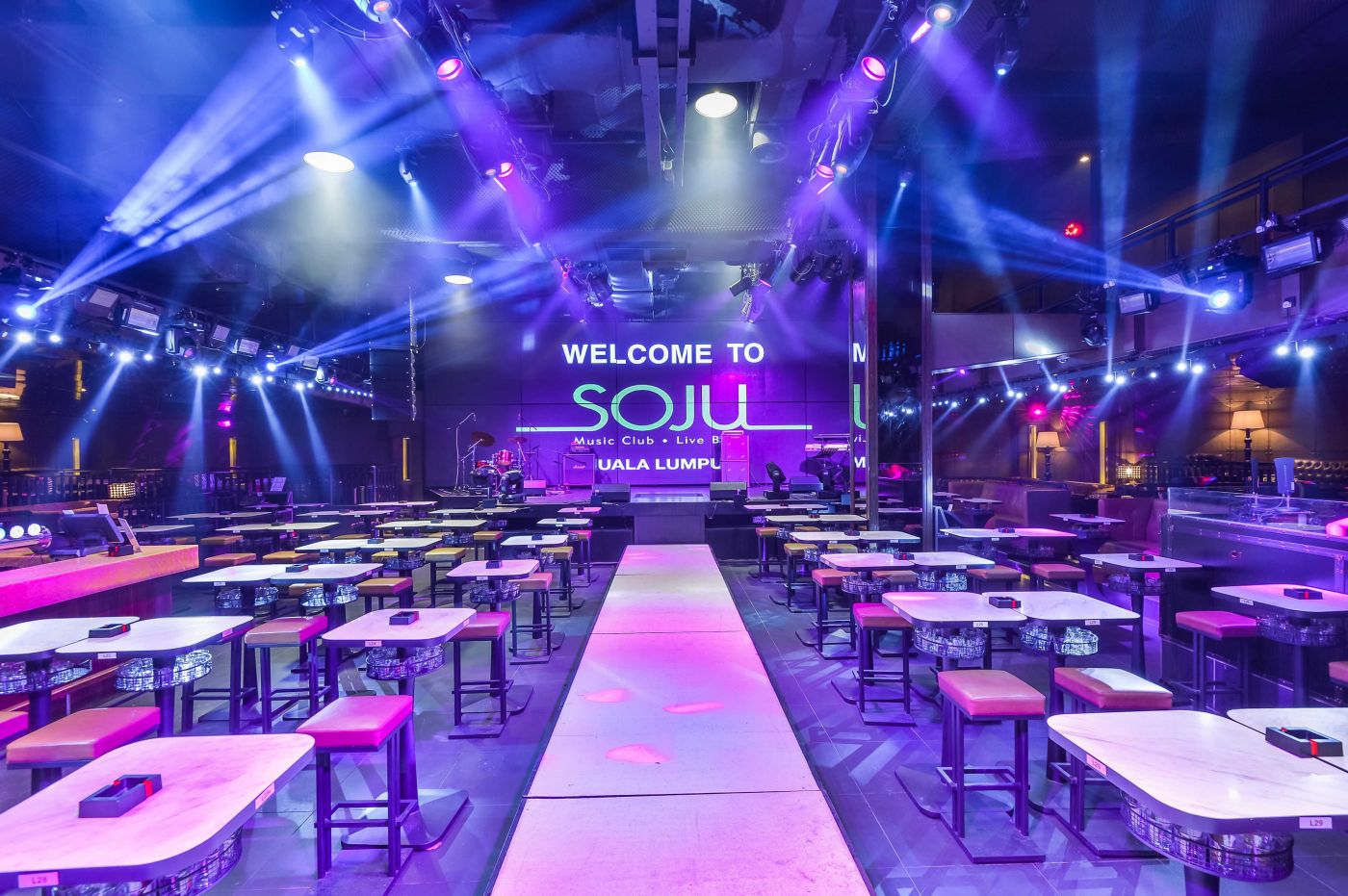整個電音酒吧設計的中軸線就是常常的T臺,對面則是一面大大的LED屏幕,“WELCOME TO SOJO!”兩側密集的射燈從不同的角度,照亮了這本應黑暗一片的白色路徑,彷如星光大道。
