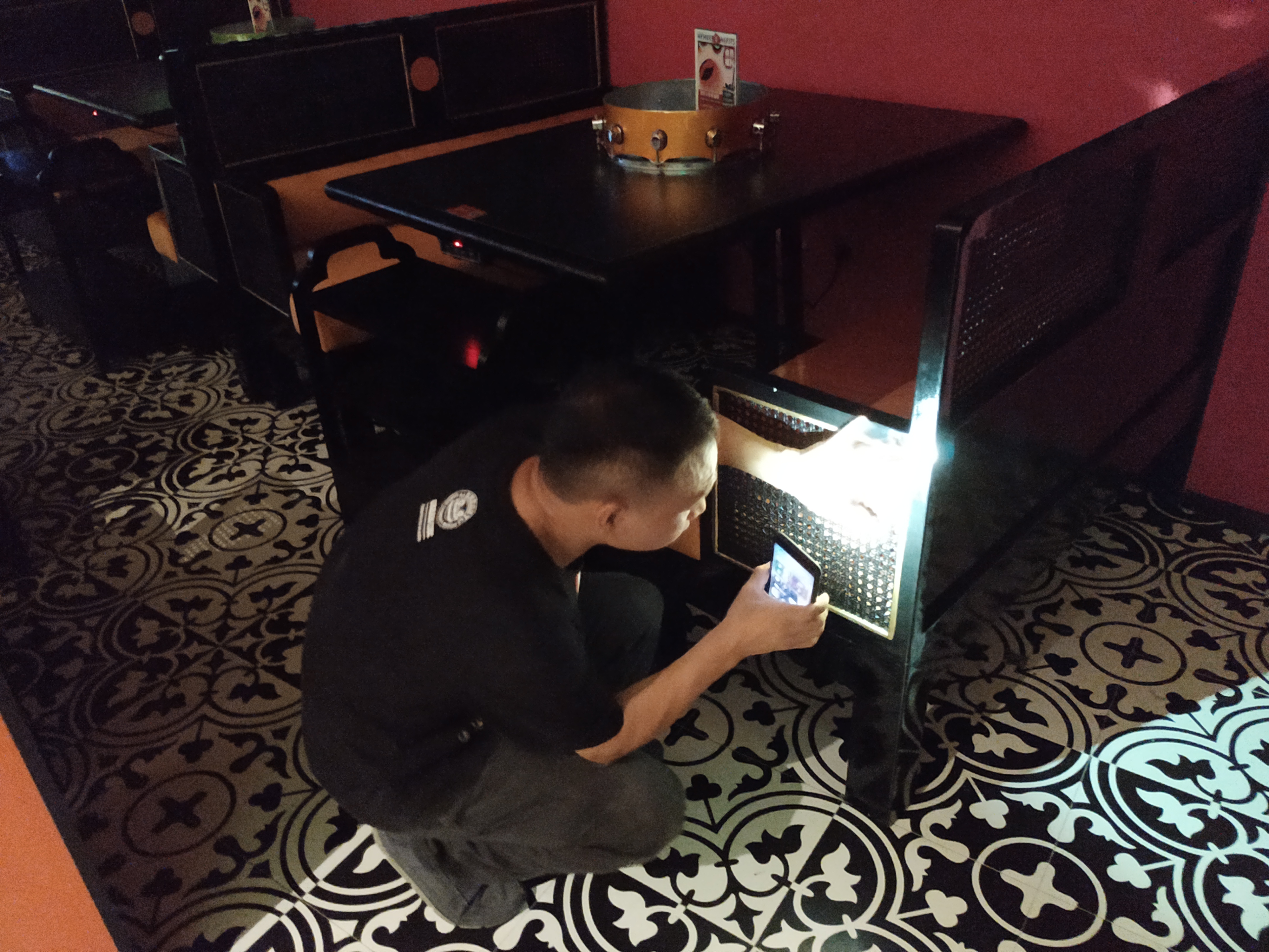 戲鳳記和元気壽司同在卓悅匯。而戲鳳記的安裝其實早在幾天前就已經(jīng)完成,現(xiàn)在內(nèi)部封測階段。凌晨2點的戲鳳記早已落鎖,且關(guān)閉了所有的燈光,但谷先生還是決定去看看。借助外面透過來的微光和手機自帶的手電筒光,谷先生仔細(xì)查看貝帝的家具、電磁爐,以期發(fā)現(xiàn)再次改進的空間。